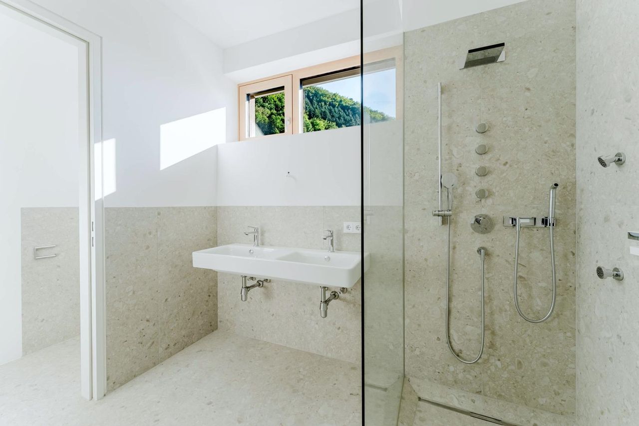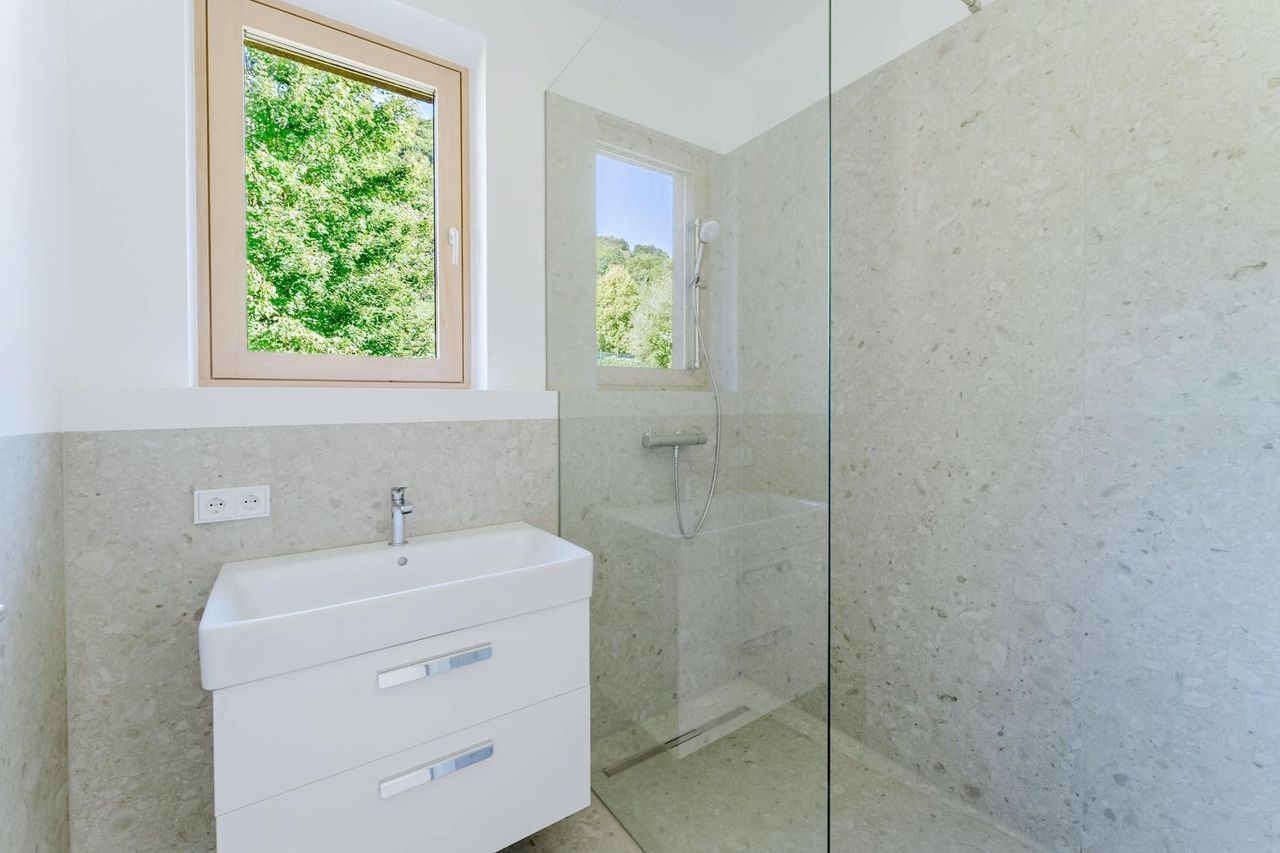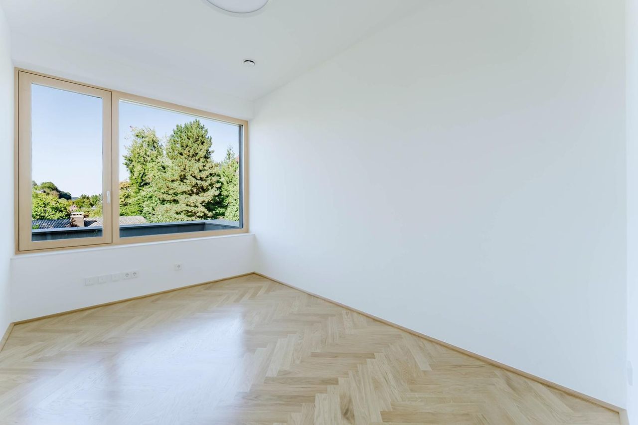 Die elegante Architektur des Baukörpers und die hochwertige Ausstattung schaffen ein Ambiente, das höchsten Wohnkomfort verspricht. Große Fensterfronten sorgen für helle, offene Räume und verbinden Innen- mit Außenbereich auf harmonische Weise.