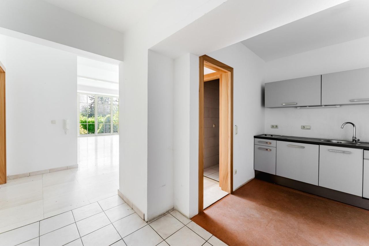 DIE 4-Zimmer-WOHNUNG, im Gartengeschoss, mit einer Nutzfläche von ca. 161,71 m², verfügt aktuell über vier unterschiedlich große Zimmer, eine Diele, eine Teeküche, ein Bad mit WC und ein weiteres WC. Der Zugang zur Wohnung erfolgt über die Allgemeinfläche des Stiegenhauses. Eine eigene Eingangsmöglichkeit könnte im Zuge von Umbauarbeiten geschaffen werden.