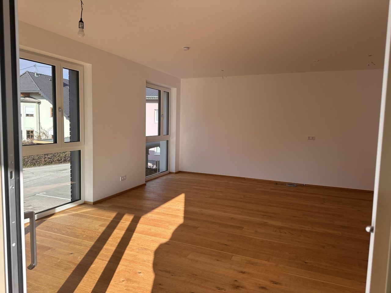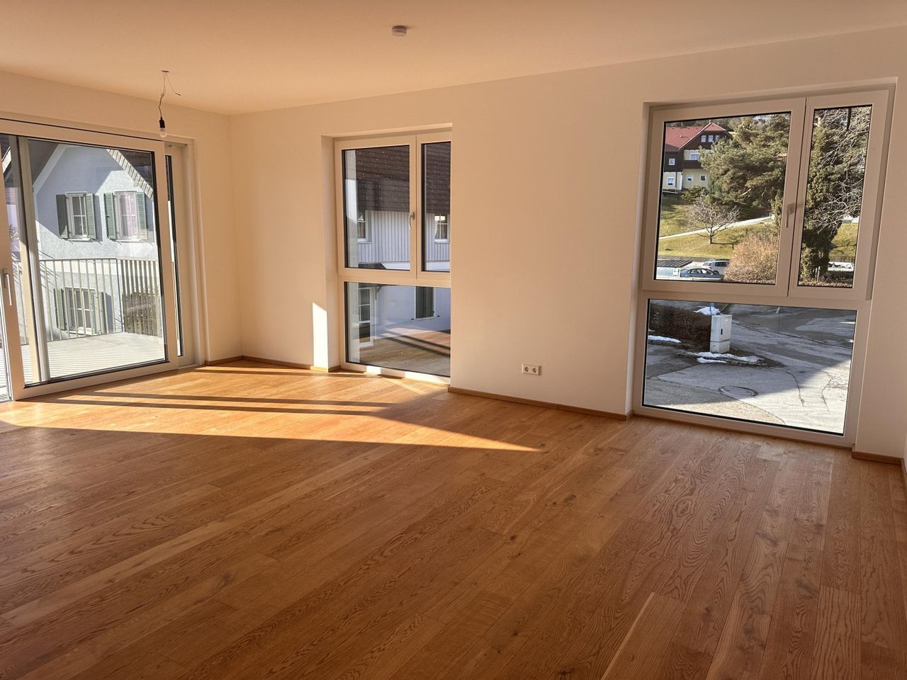 Bodentiefe Fenster schaffen einen lichtdurchfluteten Wohnbereich, hochwertige Parkett- und Fliesenböden runden das Gesamtbild ab.