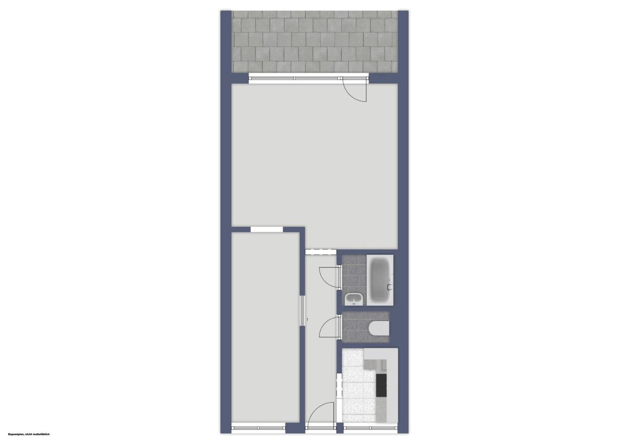Die Raumaufteilung wurde optimal genutzt und umfasst ein ruhiges, längliches Schlafzimmer sowie eine bereits möblierte Küche. Das Badezimmer ist mit einer Badewanne ausgestattet. Das WC ist separat.