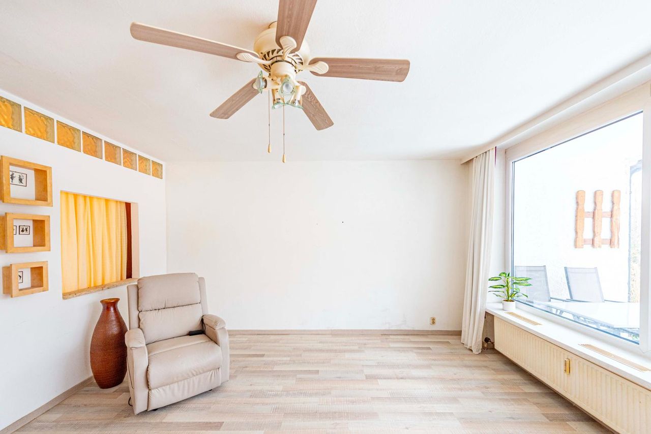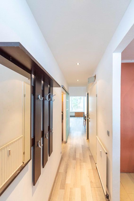 Vom Hauseingang 2 Etagen tiefer befindet sich die Wohnung, die sich schließlich ebenerdig zum weitläufigen Gemeinschaftsgarten öffnet. Das Herzstück der Immobilie ist das einladende Wohnzimmer, das einen direkten Blick in den Garten bietet und so eine besonders naturnahe Atmosphäre schafft.