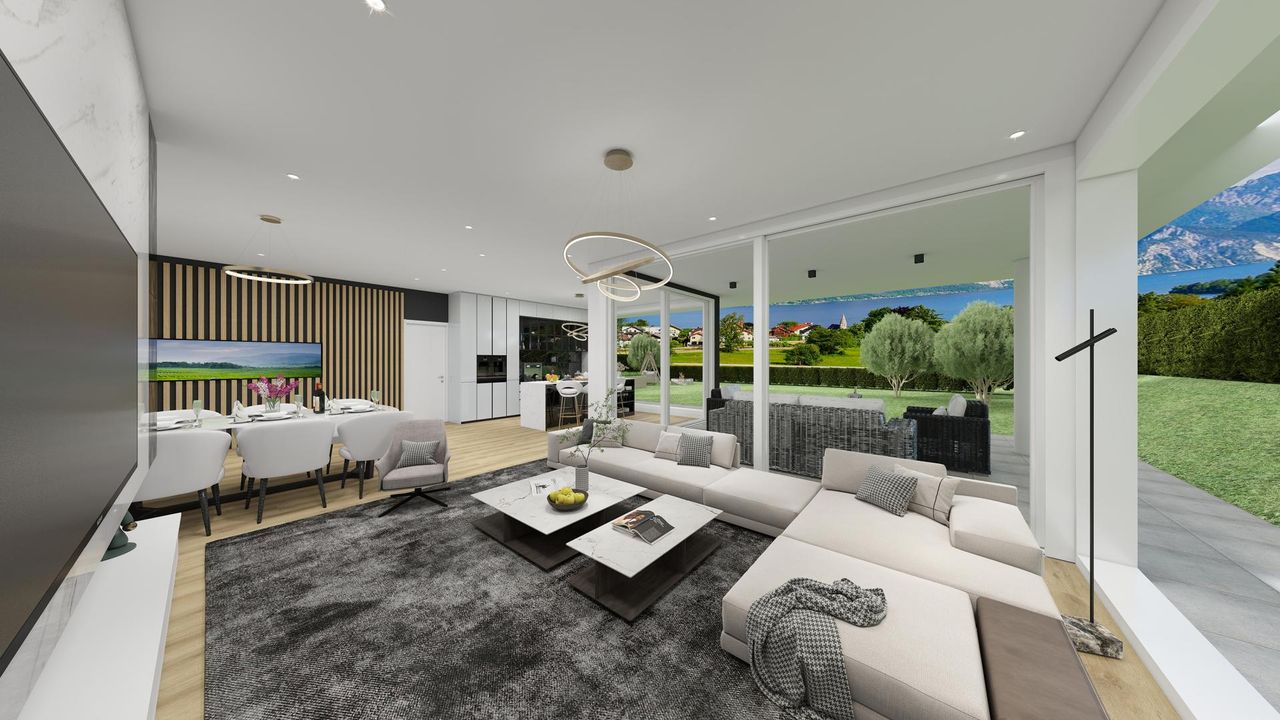 Sie öffnen die bodentiefe Glasfront, treten hinaus auf Ihre private Terrasse – das Gras im Garten ist noch feucht vom Tau, und am Waldrand grasen zwei Rehe ganz still im Morgengrauen.