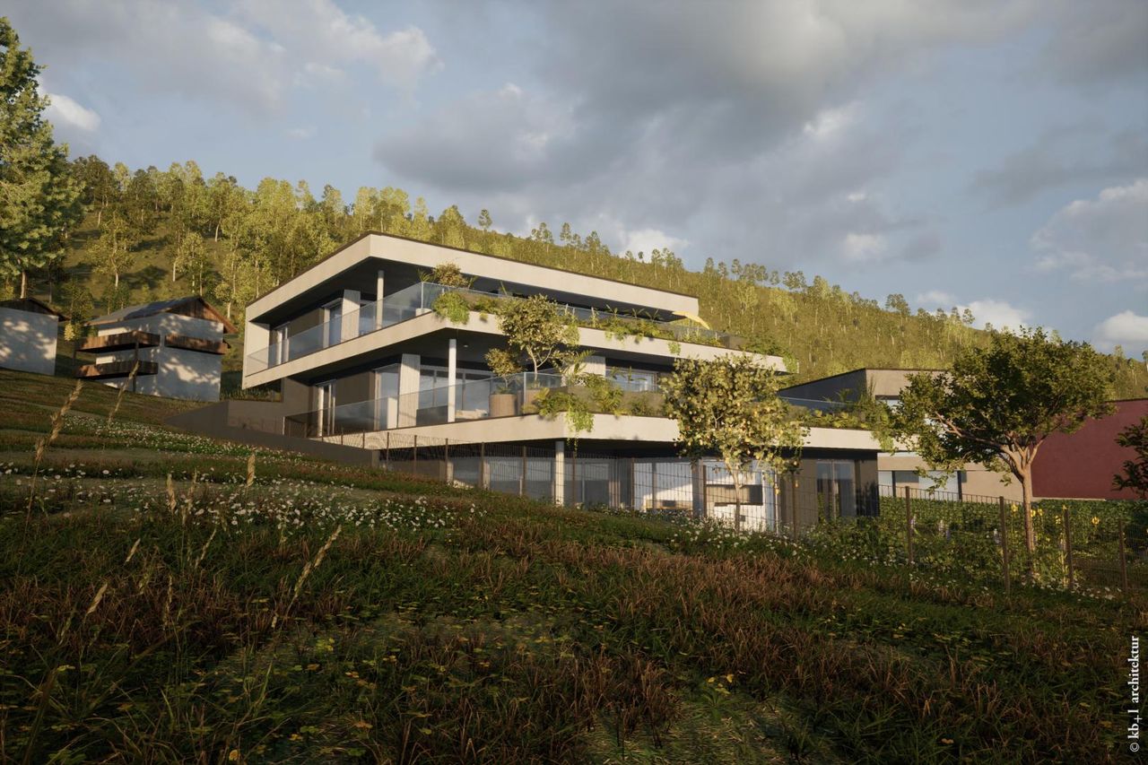 Am Ende einer ruhigen Zufahrtsstraße, eingebettet in eine sonnige Hanglage mit unverbautem Blick über Traunsee und Traunstein, entsteht ein Wohnprojekt, das sich still abhebt – in seiner Ausrichtung, seiner Form und seiner Wirkung.