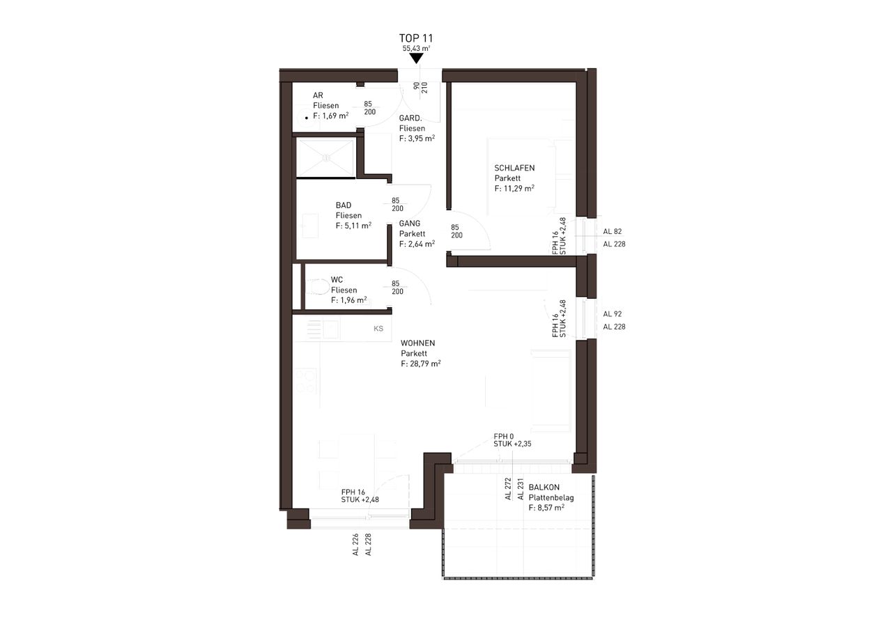 Die 2-Zimmer-Wohnung mit ca. 55 m² ist im 2. Obergeschoss situiert und befindet sich seitlich im hinteren Baukörper (Haus 1). Der ausgezeichnet zugeschnittene Grundriss bietet alle Annehmlichkeiten wie einen Abstellraum, eine separate Toilette und ein Wohnzimmer mit ausreichend Platz für eine Wohnküche, eine Couch, ein TV-Board und einen gemütlichen Esstisch. Anschließend an das Wohnzimmer befindet sich der ca. 8,57 m² große nach Süden ausgerichtete Balkon.