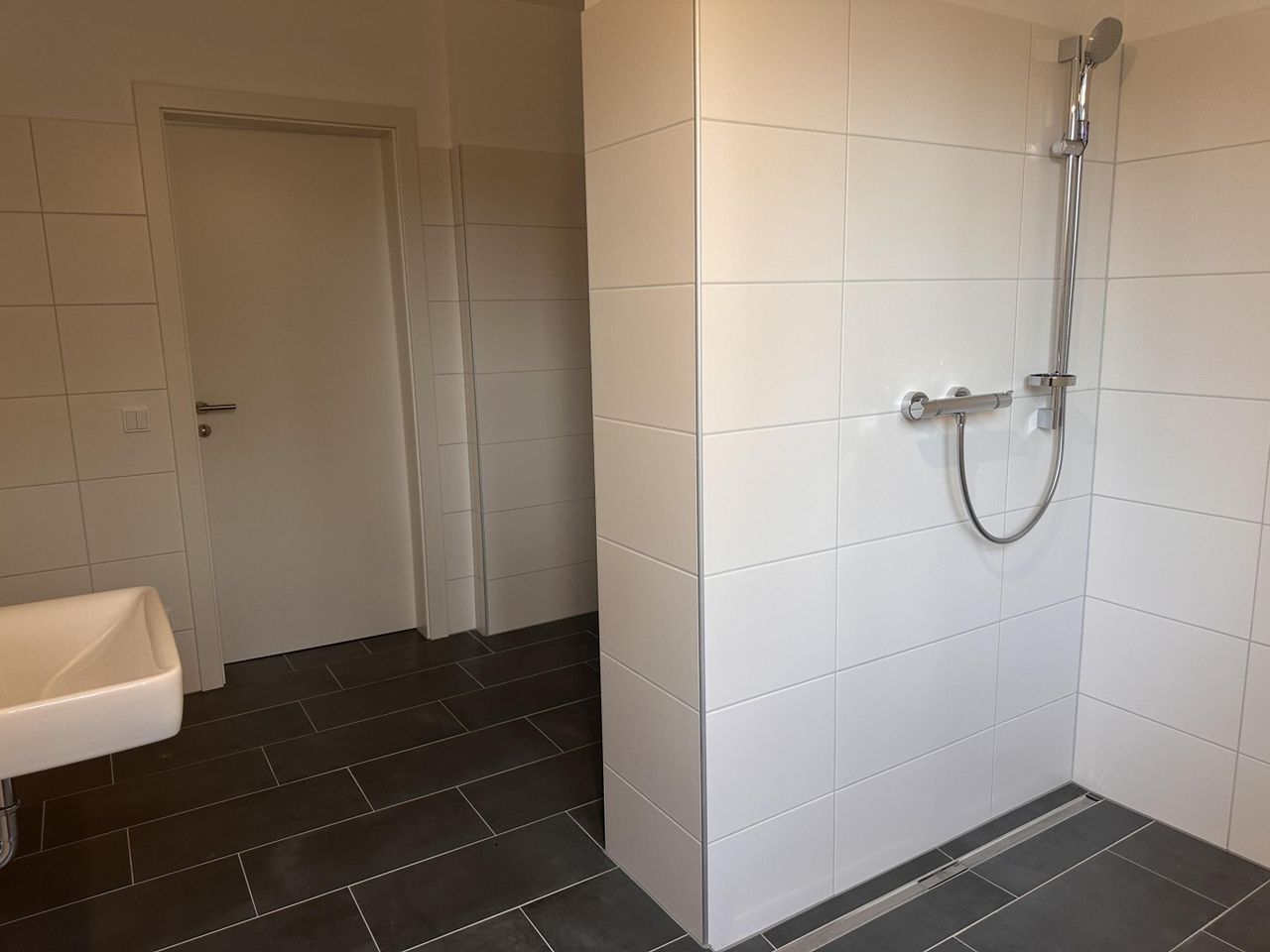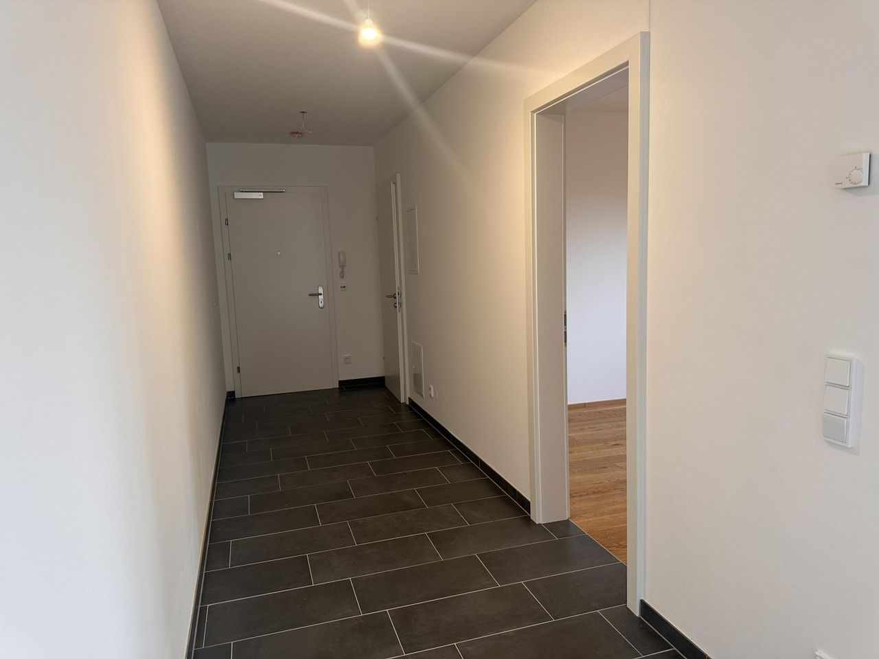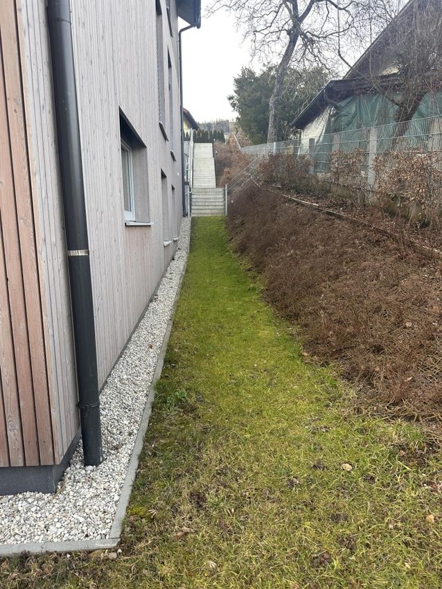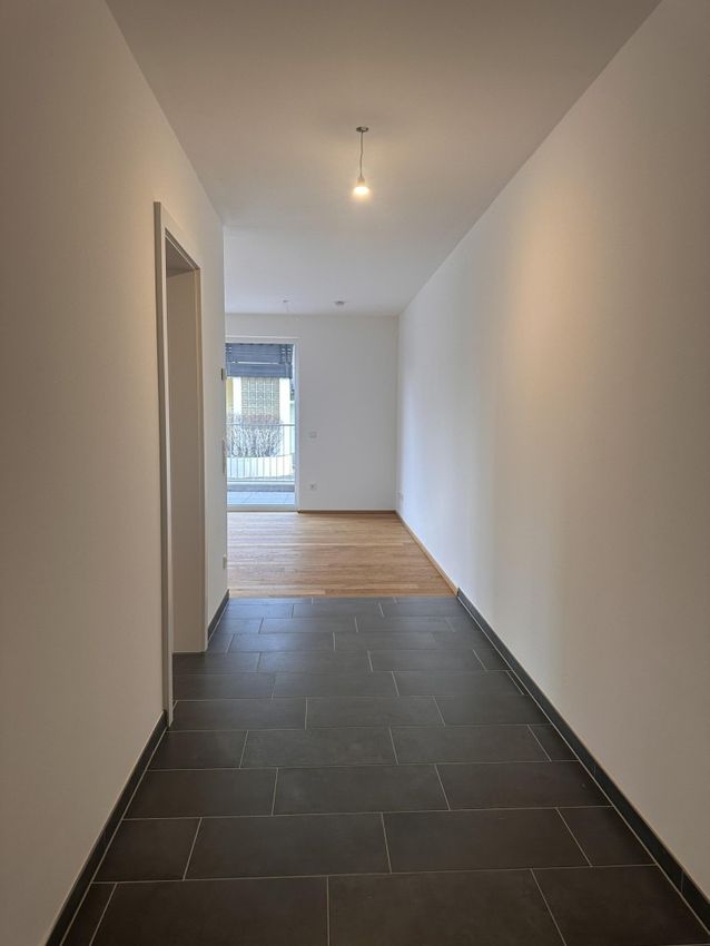 Die durchdachte Raumaufteilung umfasst einen Vorraum, ein großzügiges Badezimmer mit WC und großer Dusche, ein Schlafzimmer sowie eine helle Wohnküche mit direktem Ausgang auf die Terrasse und den angrenzenden Grünstreifen.