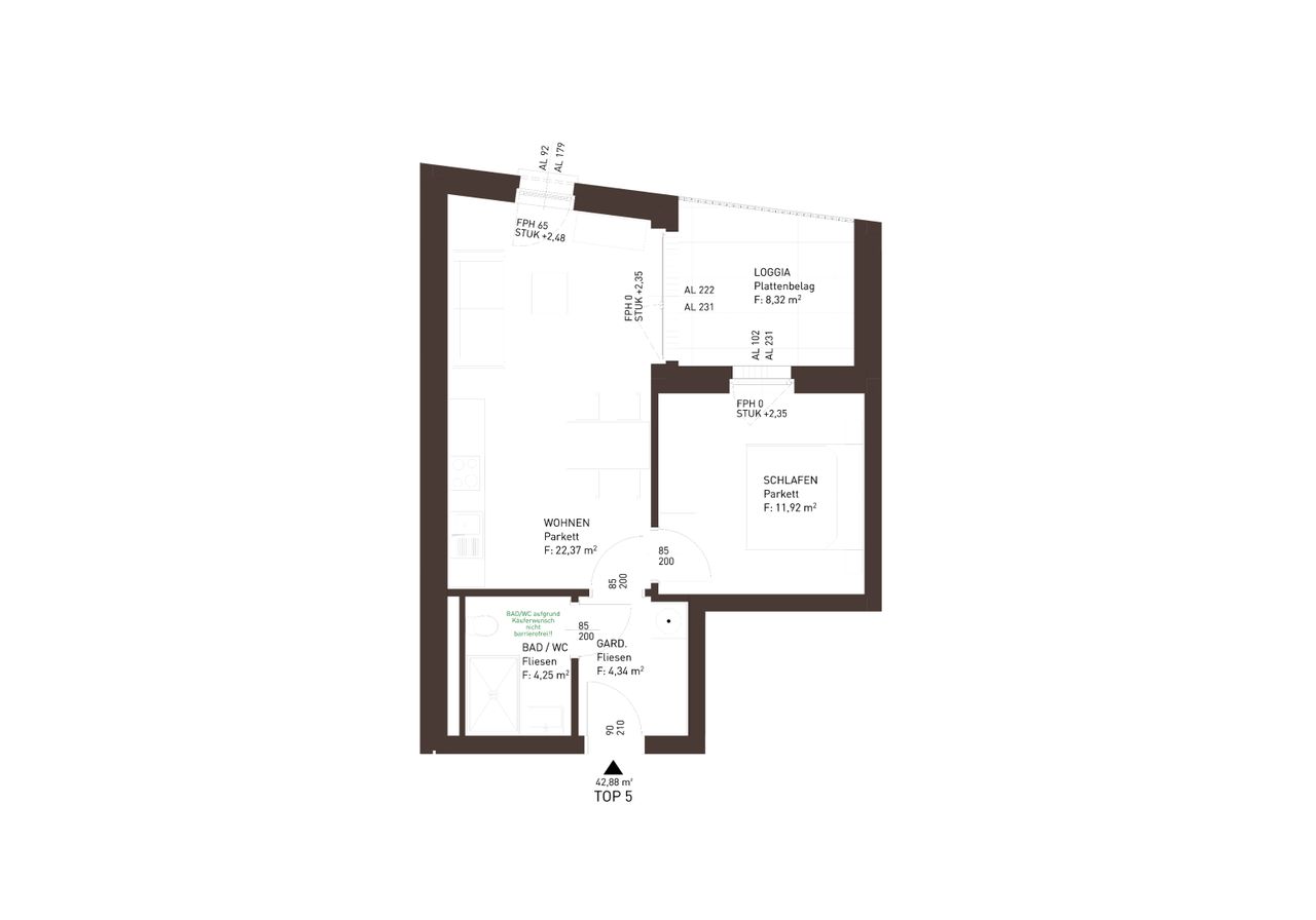 Der GRUNDRISS der provisonsfreien 2-Zimmer-Wohnung Top 5 befindet sich im Baukörper 2 (vorderer Baukörper) im 1. OG und ist mit einer Loggia ausgestattet. Die sehr gut aufgeteilte und helle Wohnung bietet Ihnen viel Platz und ein sehr schönes Wohnzimmer mit offener Wohnküche. Anschließend an das Wohn- und Schlafzimmer befindet sich die Loggia mit ca. 8,32 m².
