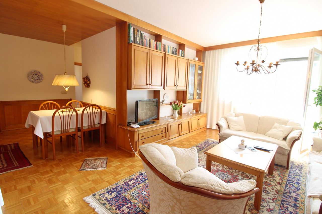 Das Wohnzimmer bietet Zugang zur Loggia mit Blick ins Grüne. Zusätzlich stehen zwei weitere Zimmer sowie eine separate Küche zur Verfügung. Ein Kellerabteil und ein Pkw-Abstellplatz sind ebenfalls vorhanden.