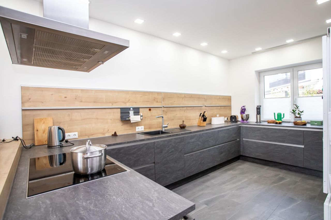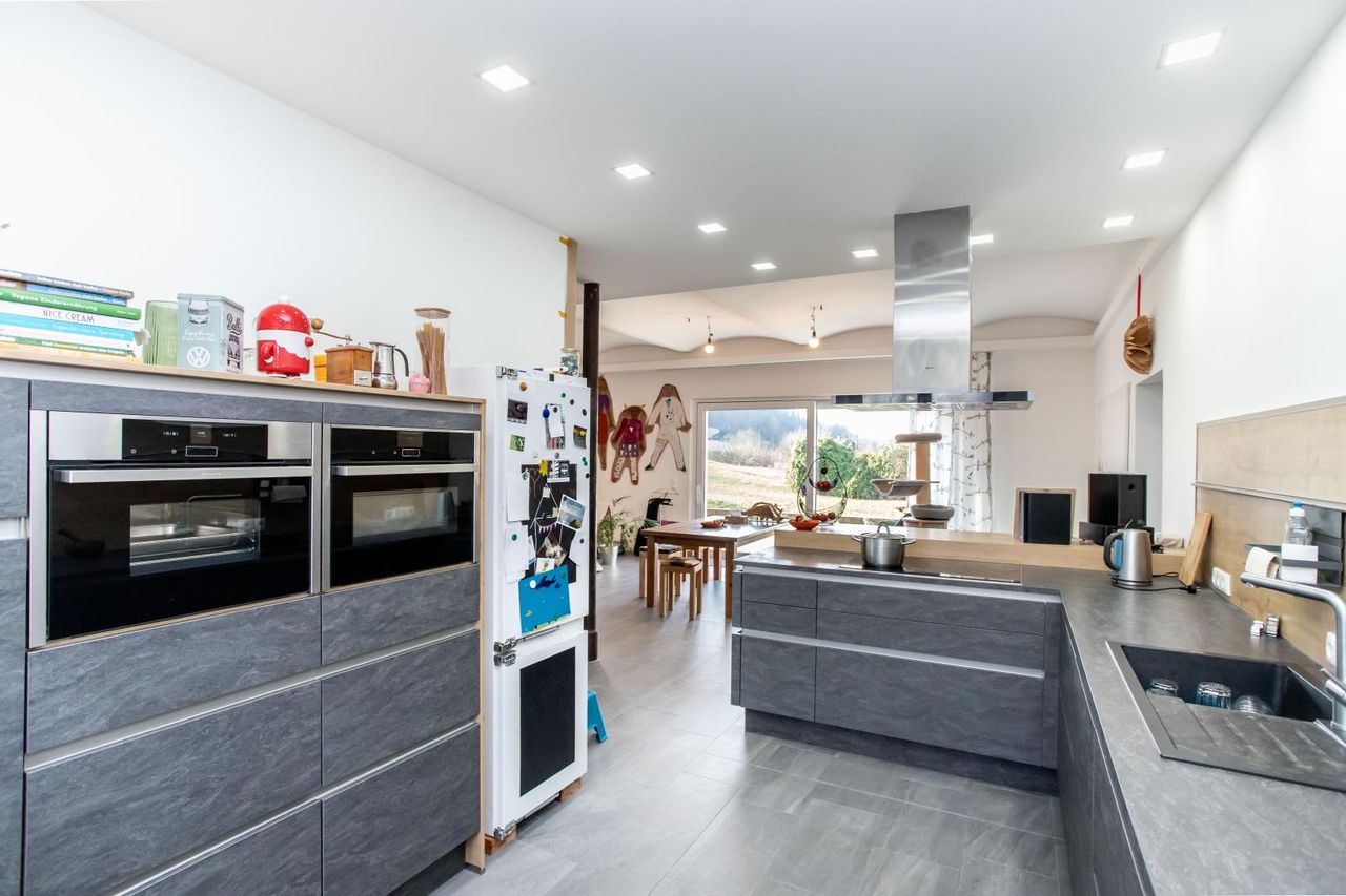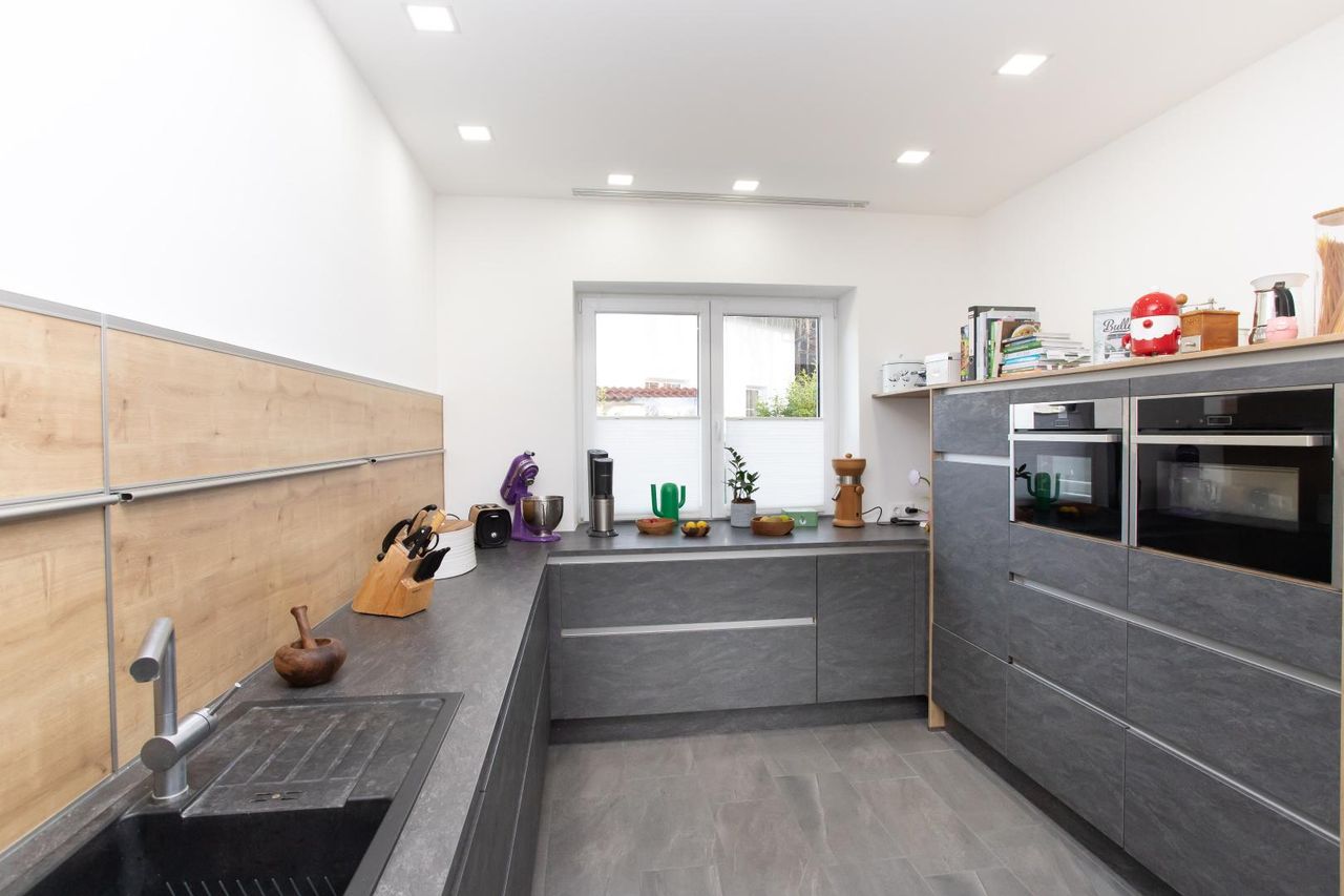 Die offen gestaltete Markenküche mit hochwertigen Geräten (u.a. Backofen und Dampfgarer der Fa. Neff) ist perfekt in den Wohnbereich integriert – ideal für gemeinsames Kochen, lange Abende mit Freunden oder das Familienleben im Alltag.