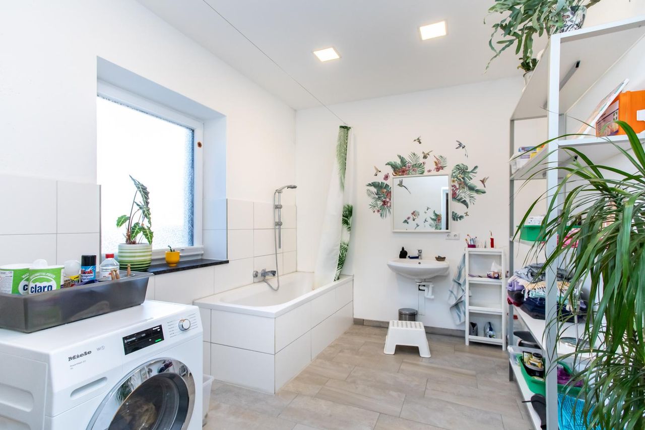 Das Badezimmer mit Badewanne, Fenster und Waschmaschinenanschluss sowie ein separates WC (ebenfalls mit Fenster) sorgen für Alltagstauglichkeit und Komfort.