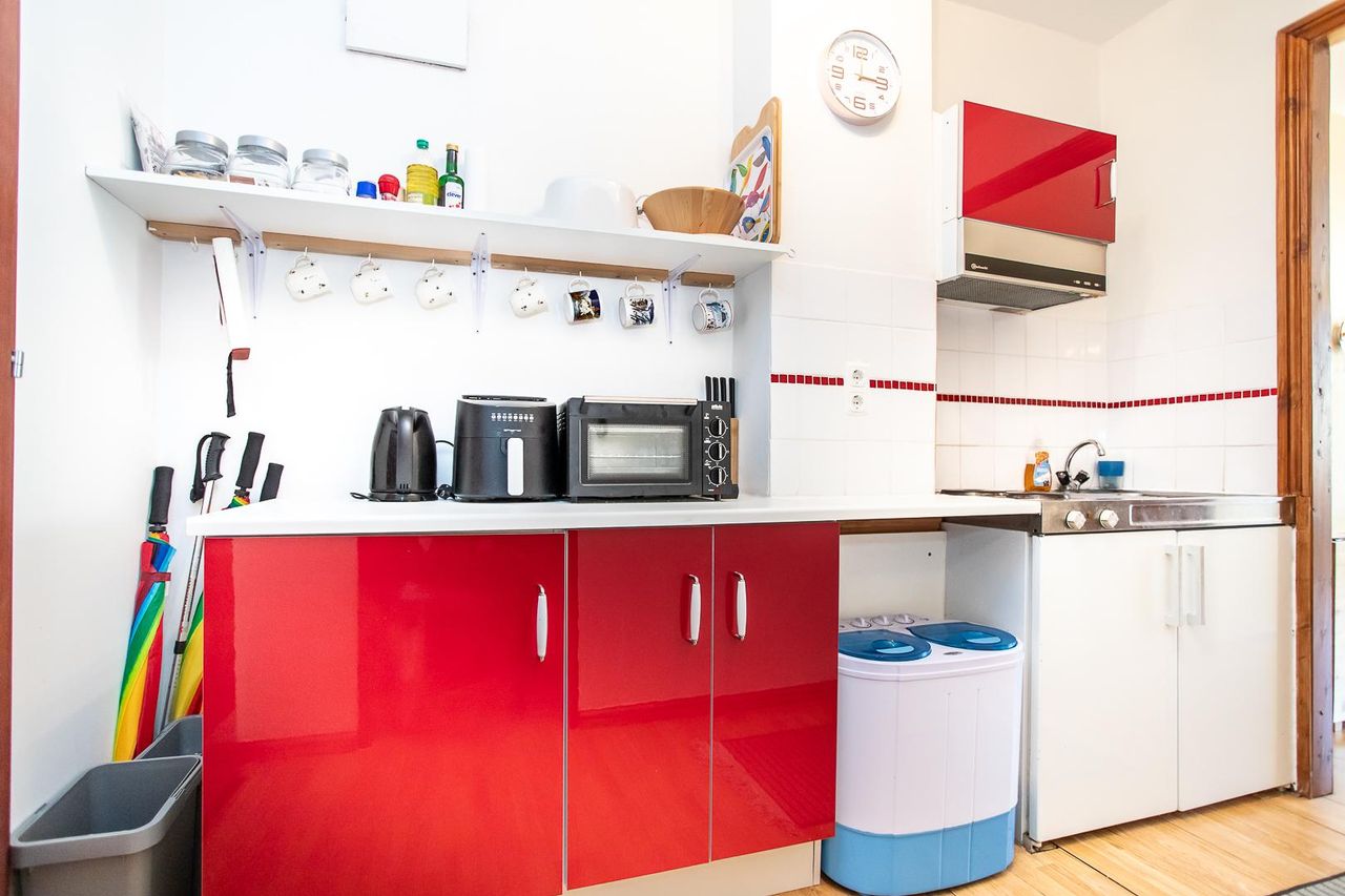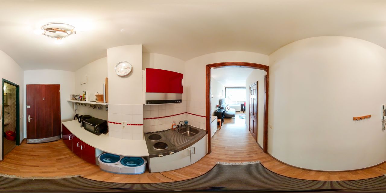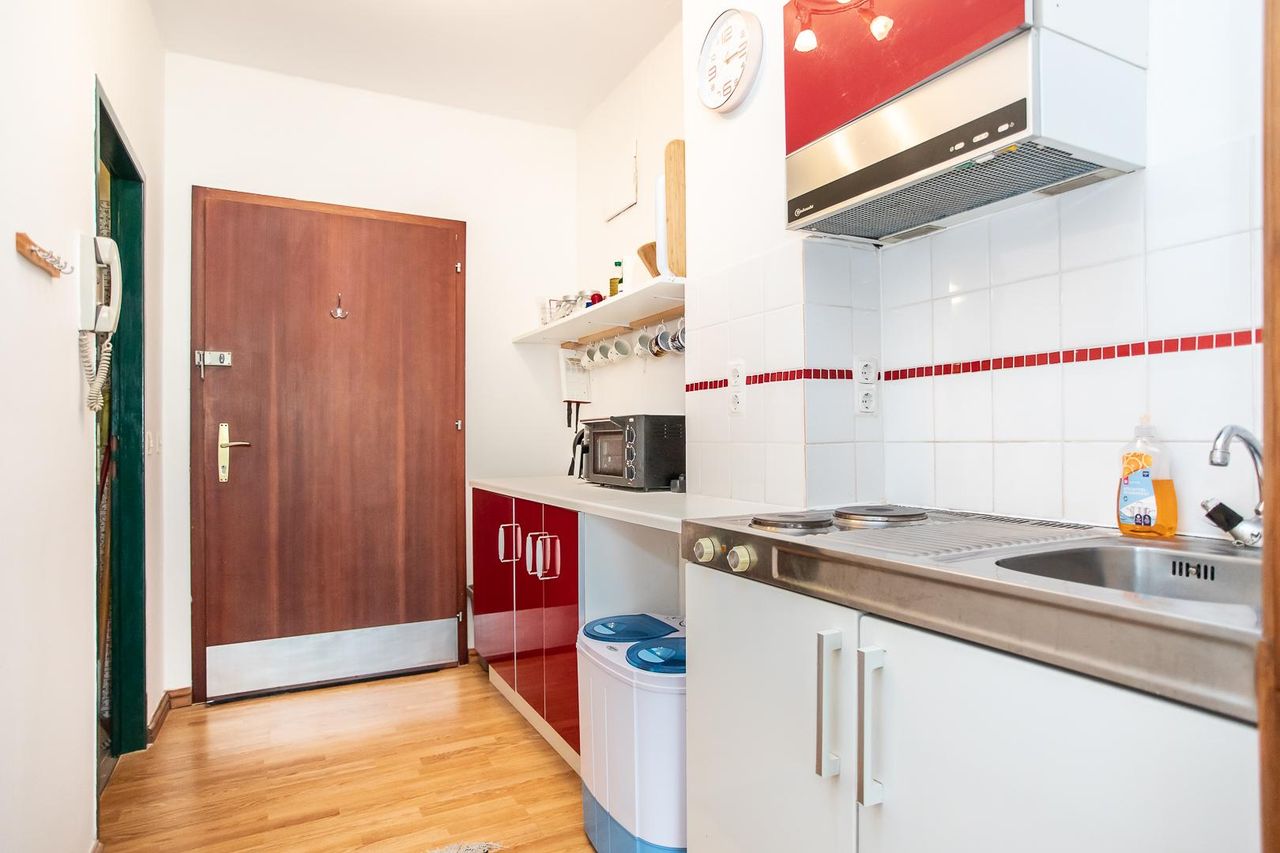 Die Raumaufteilung ist wie folgt: ein offener Vorraum mit Küche, Wohn-/Esszimmer mit einem integrierten kleinen Schlafbereich und ein Badezimmer mit Dusche und WC.