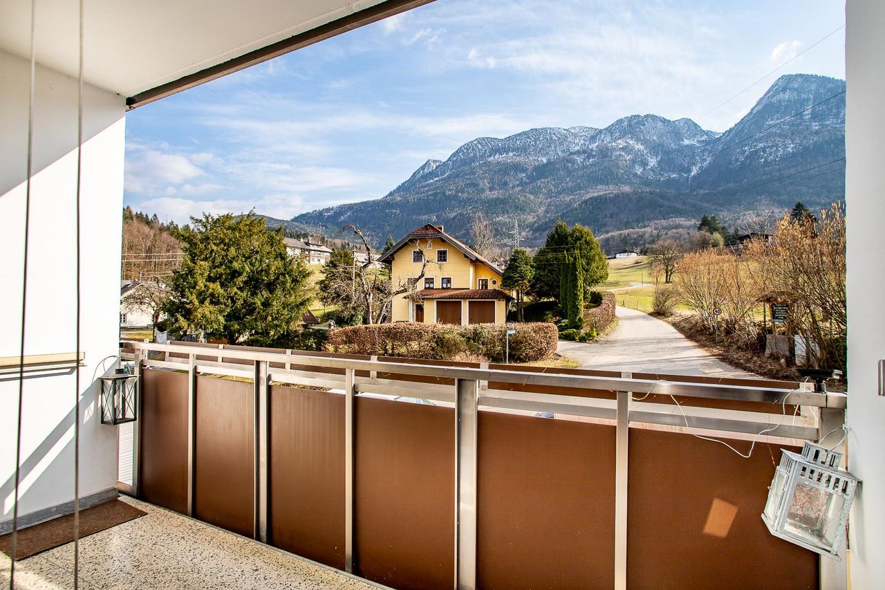Zusätzlich gibt es eine südlich ausgerichtete Loggia mit ca. 5,70 m². Hier genießen Sie vom 1. Stock einen schönen Blick ins Grüne und auf den Bad Ischler Hausberg – die Katrin. Die Loggia erreichen Sie vom Wohn-/Esszimmer.