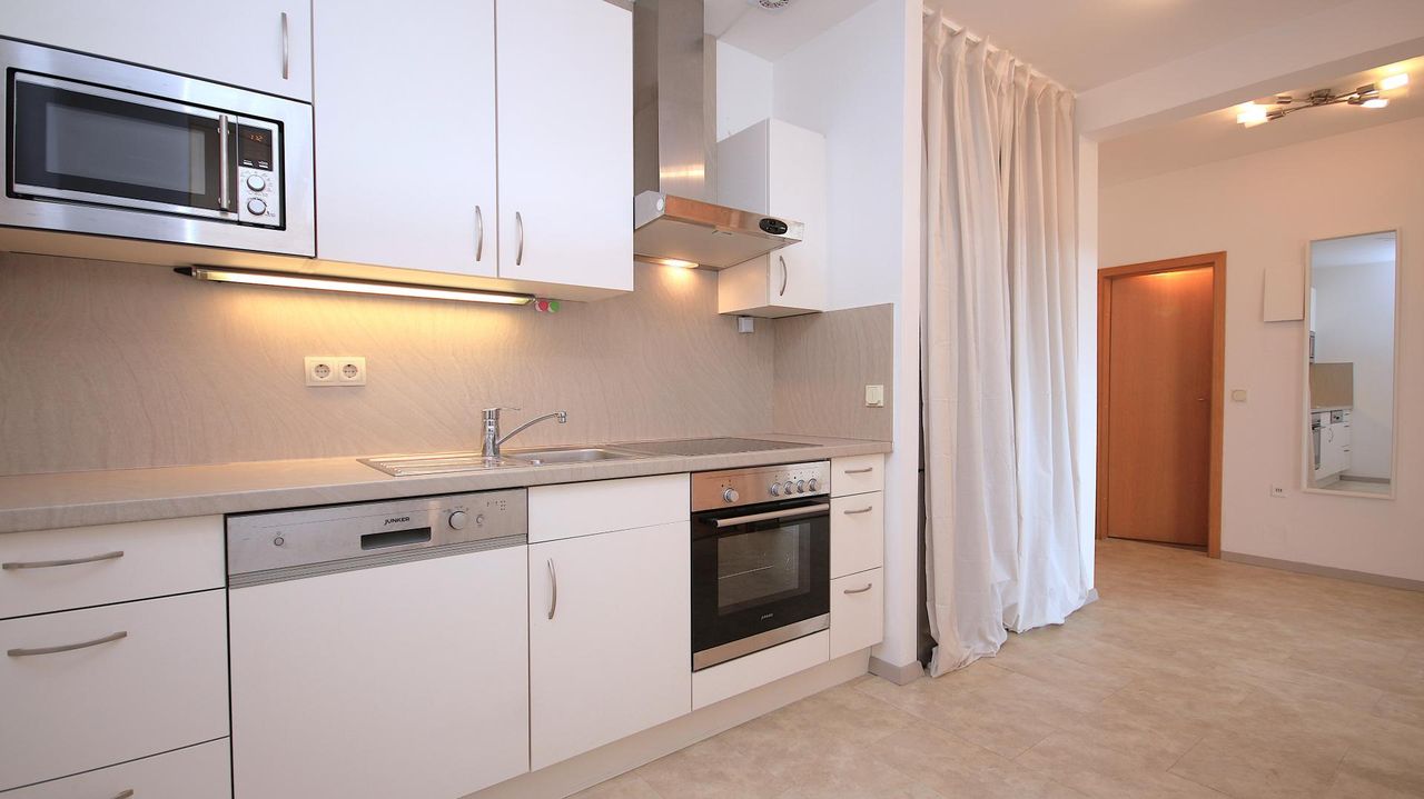 - Offene Küche: voll möbliert mit modernen Küchenmöbeln und Geräten (großer Kühlschrank mit Gefrierfach, Backofen mit Ceranfeld und Dunstabzugshaube, Geschirrspüler, Mikrowelle)