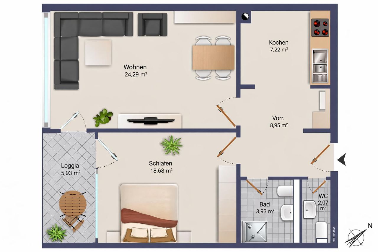 - Schlafzimmer: ca. 18,68 m² mit Zugang zur Loggia