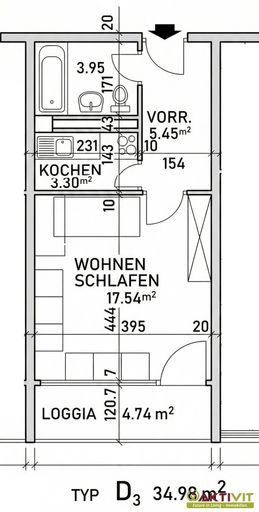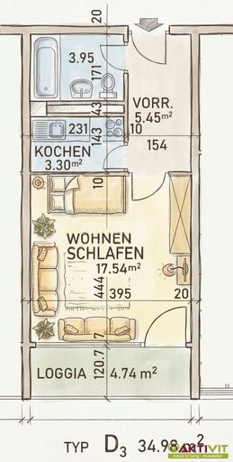 Die Wohnung verfügt über eine Wohnfläche von rund 36 m² und befindet sich im 3. Obergeschoss eines Wohnhauses mit Personenaufzug. Der Grundriss gliedert sich in einen Vorraum, ein Badezimmer mit WC, einen Kochbereich sowie einen kombinierten Wohn- und Schlafraum. Vom Wohnbereich aus ist der westseitig ausgerichtete Balkon erreichbar, der zusätzlichen Freiraum bietet. Die Räume sind funktional angeordnet und überwiegend zentral vom Vorraum erschlossen. Ergänzend steht ein Kellerabteil mit einer Fläche von etwa 3 m² zur Verfügung.