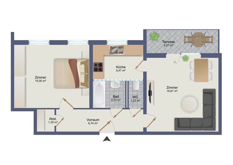 Die Raumaufteilung ist funktional und gut durchdacht: Über den Vorraum mit praktischer Abstellkammer gelangt man in das Badezimmer mit Dusche und Waschmaschinenanschluss sowie in das separate WC. Das helle Wohnzimmer mit separater Küche bietet direkten Zugang zur Loggia und schafft eine angenehme Wohnatmosphäre. Ergänzt wird das Raumangebot durch ein ruhiges Schlafzimmer.