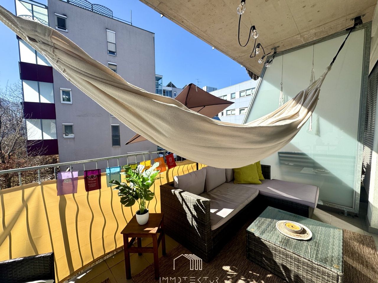 Ein über 8 m² großer, überdachter Balkon mit West-Ausrichtung – hier genießen Sie die Nachmittagssonne und verlängern Ihren Wohnraum ins Freie.