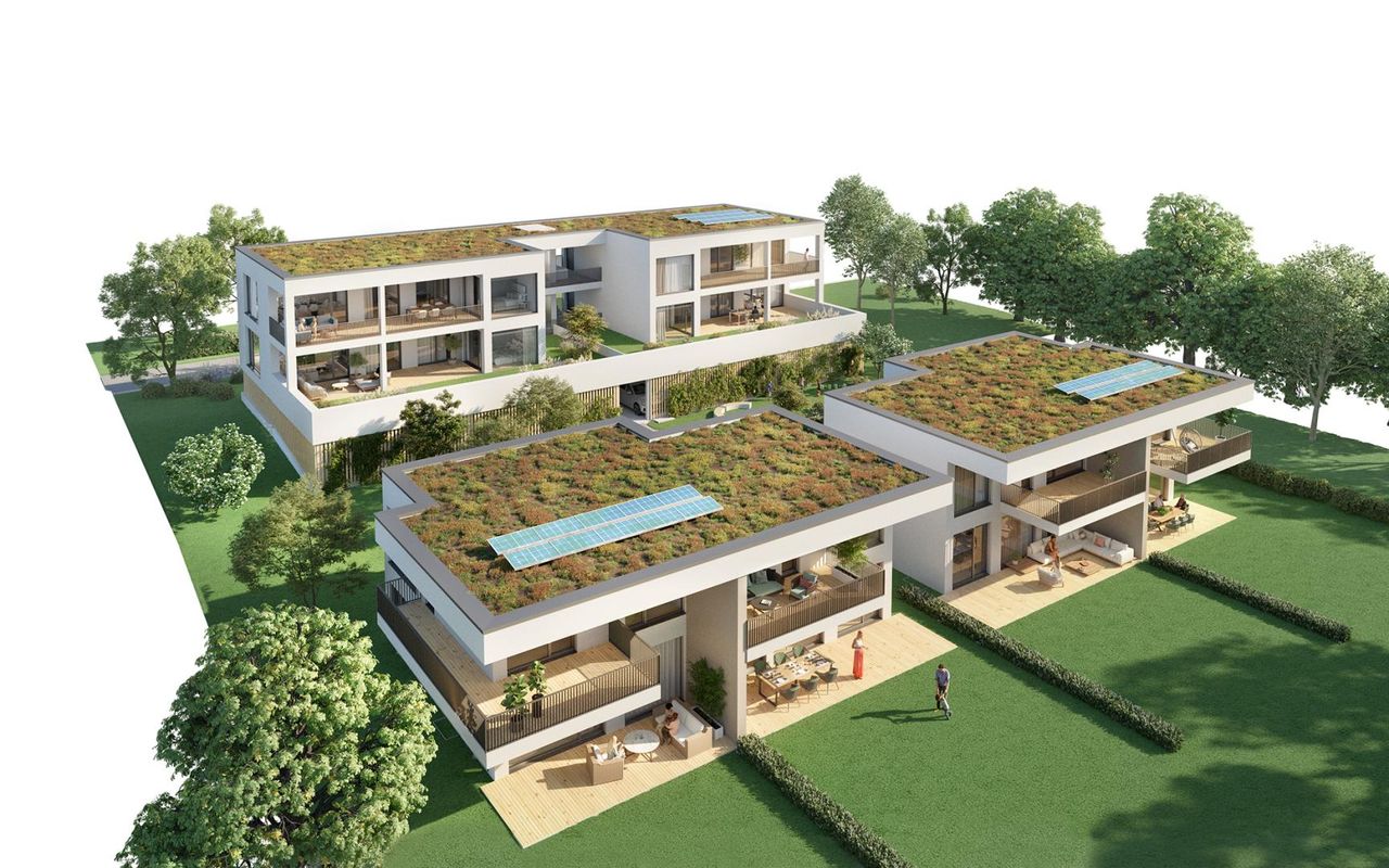 3 Baukörper mit insgesamt 8 Wohneinheiten und einem Parkdeck fügen sich harmonisch in die Umgebung ein.
