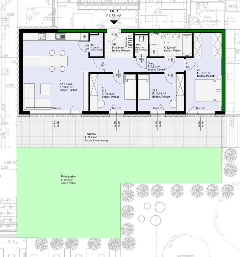 -Großer Wohn/Essbereich mit integrierter Küche mit Abstellraum und Ausgang auf die fast 40 m2 große Terrasse und Eigengarten mit ca. 80m2