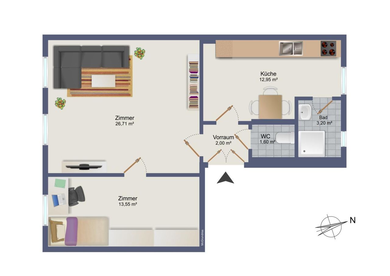 Die Wohnung umfasst ca. 60 m² Wohnfläche und besteht aus: