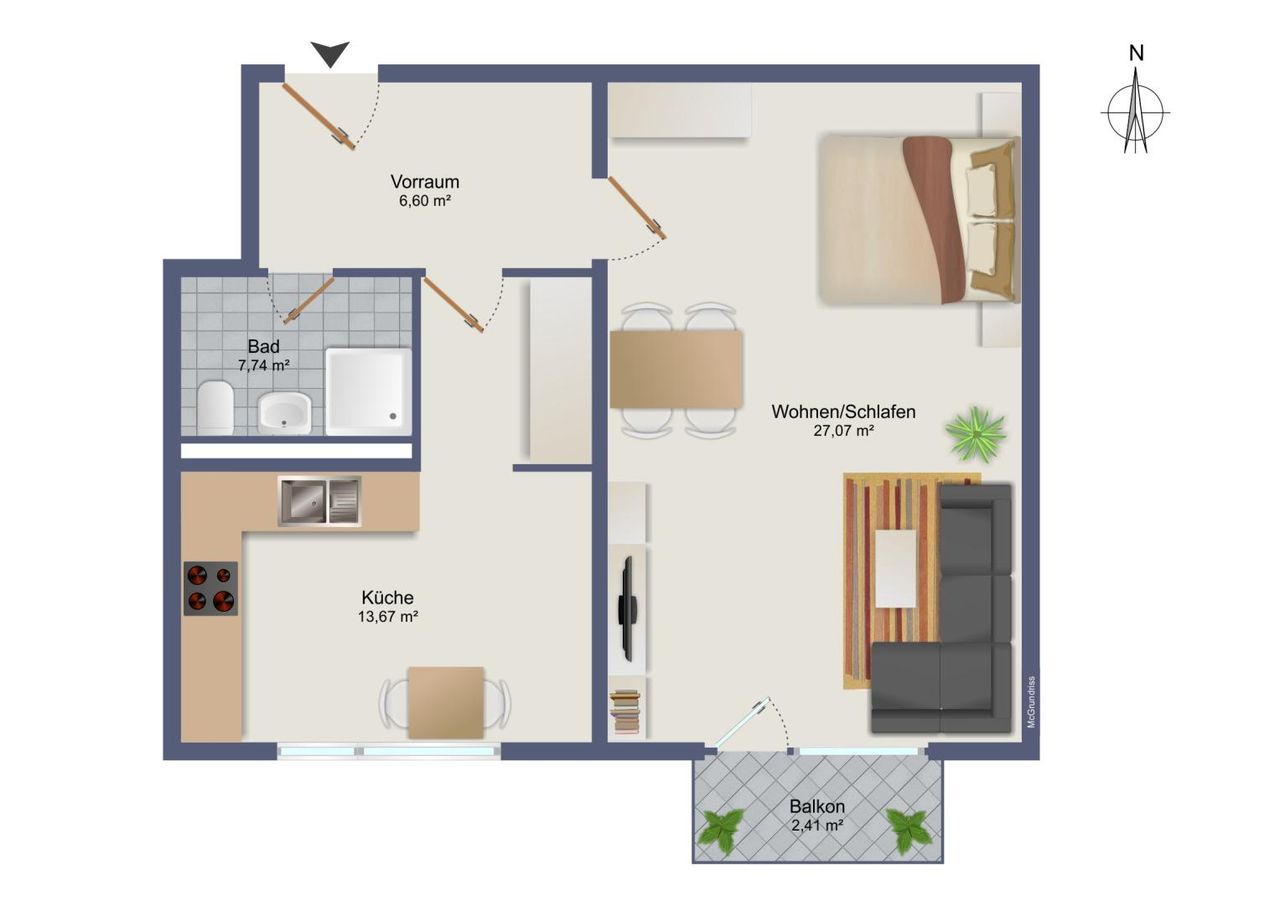Auf diesen ca. 51m² finden Sie ein ca. 27m² großes Zimmer, das sich vielseitig gestalten lässt. Von dort aus gelangen Sie direkt auf den nach Süden ausgerichteten überdachten Balkon. Die separate Küche ist ca. 14 m² groß.