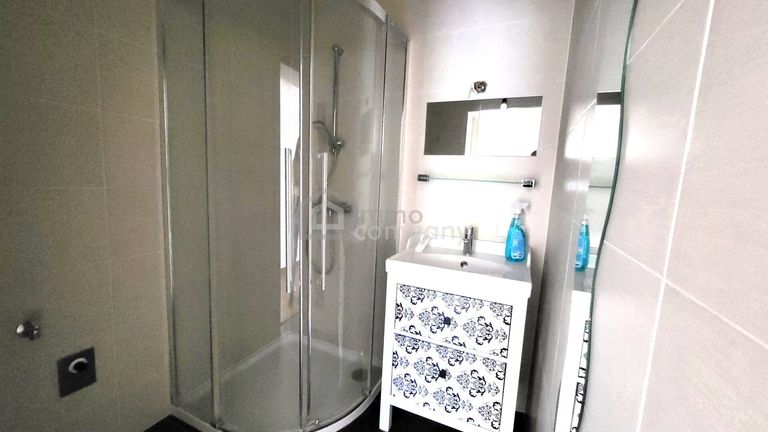 - Badezimmer mit Dusche, Waschtisch und Waschmaschinenanschluss