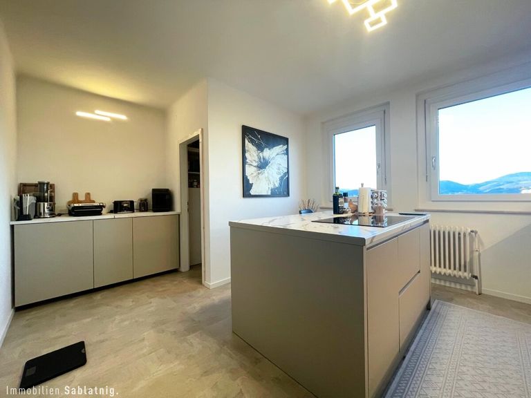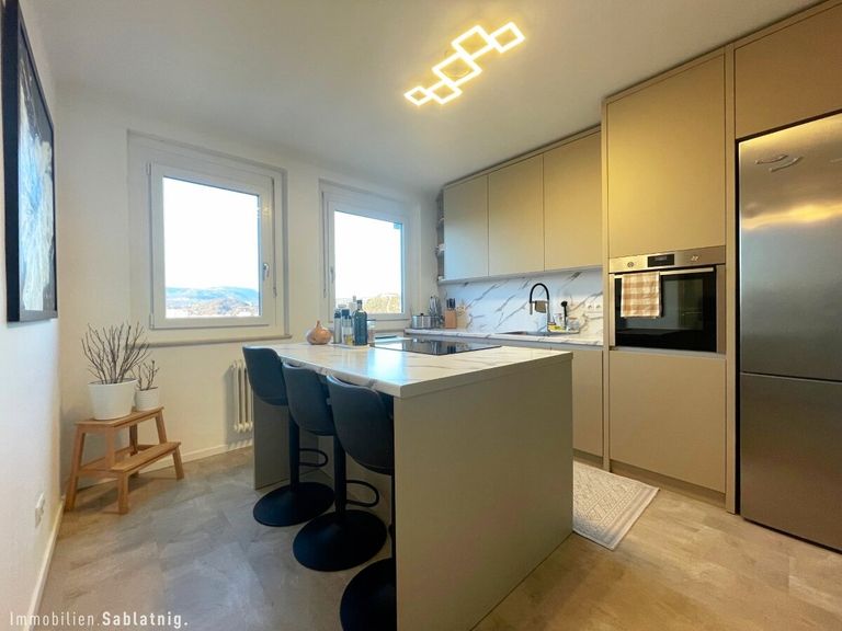 Die hochwertige Tischlerküche mit Kochinsel bietet einen direkten Blick auf den Grazer Schlossberg und vereint elegantes Design mit praktischer Funktionalität. Eine großzügige Speisekammer sorgt für zusätzlichen Komfort.