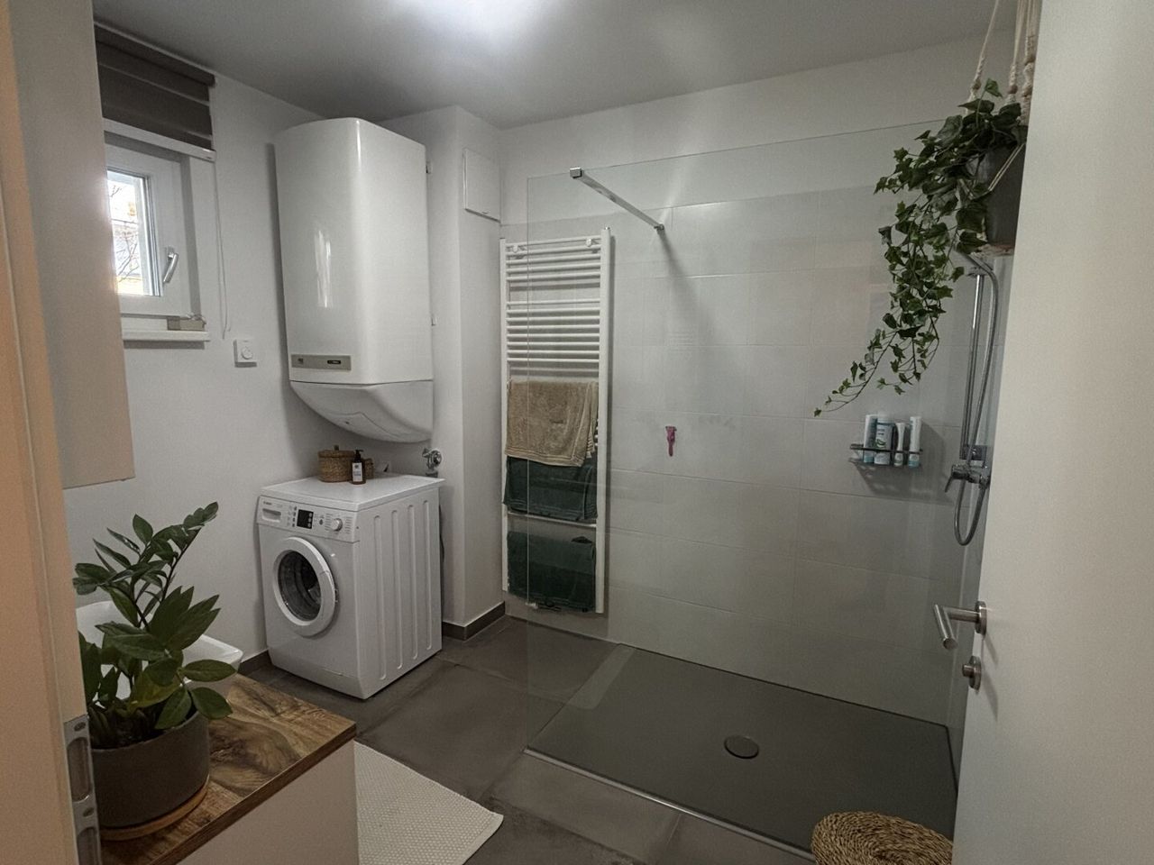 - Badezimmer mit Walk-in Dusche und Fenster
