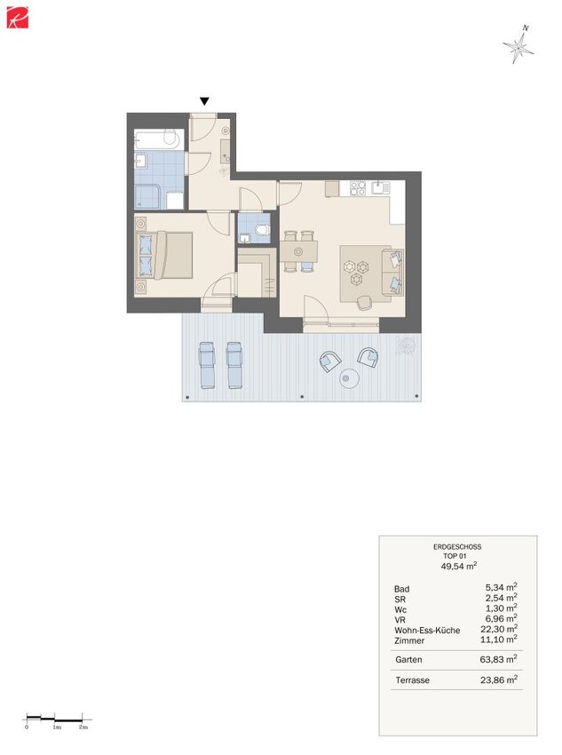 Im Angebot haben wir für Sie eine attraktive 2-Zimmer-Gartenwohnung im Erdgeschoss (Top 01) mit folgender Aufteilung: