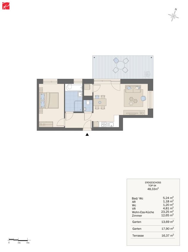 Im Angebot haben wir für Sie eine attraktive 2-Zimmer-Gartenwohnung im Erdgeschoss (Top 04) mit folgender Aufteilung: