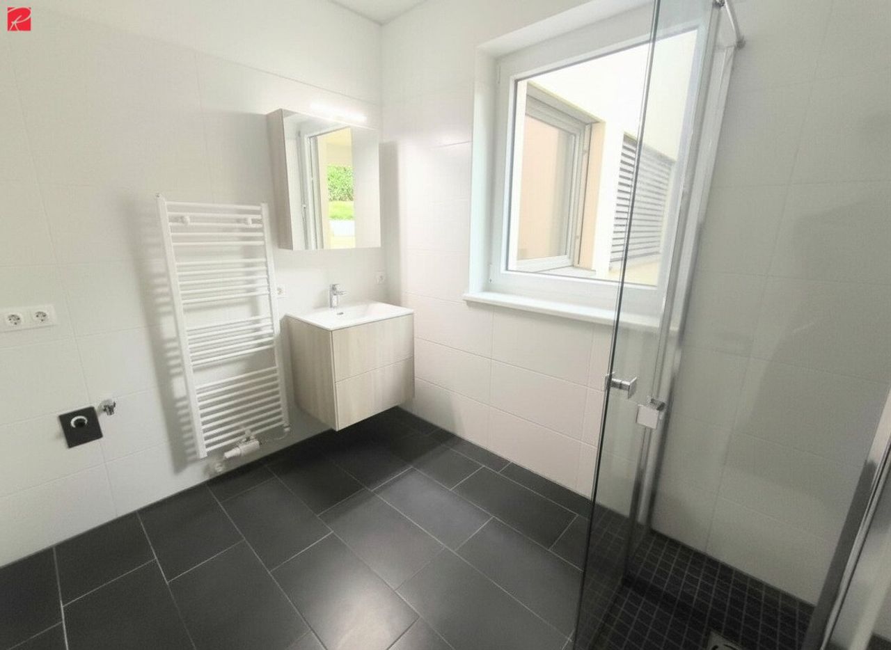 Das großzügige Badezimmer überzeugt durch sein modernes Design mit Walk-in-Dusche, Fenster und edlen dunklen Bodenfliesen. Eine praktische Abstellkammer direkt vom Flur aus bietet zusätzlichen Stauraum und rundet das Raumangebot ab.