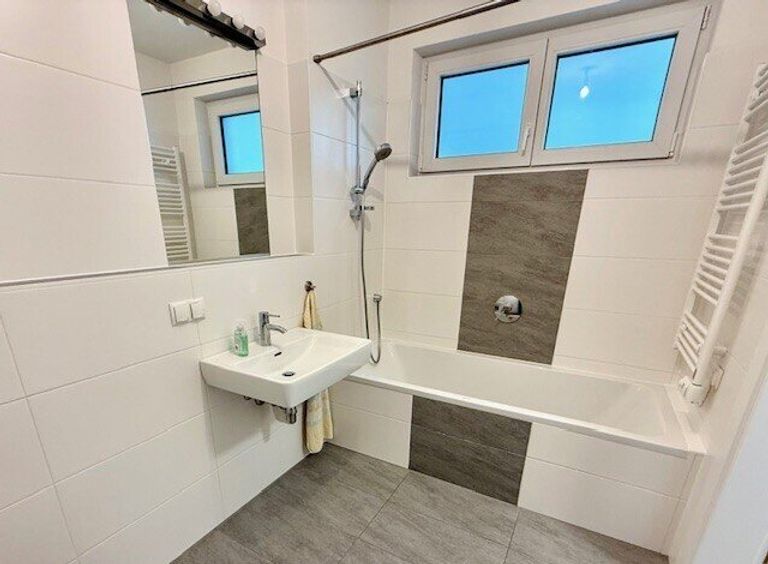 Großzügiges Badezimmer mit Badewanne und Waschmaschinenanschluss