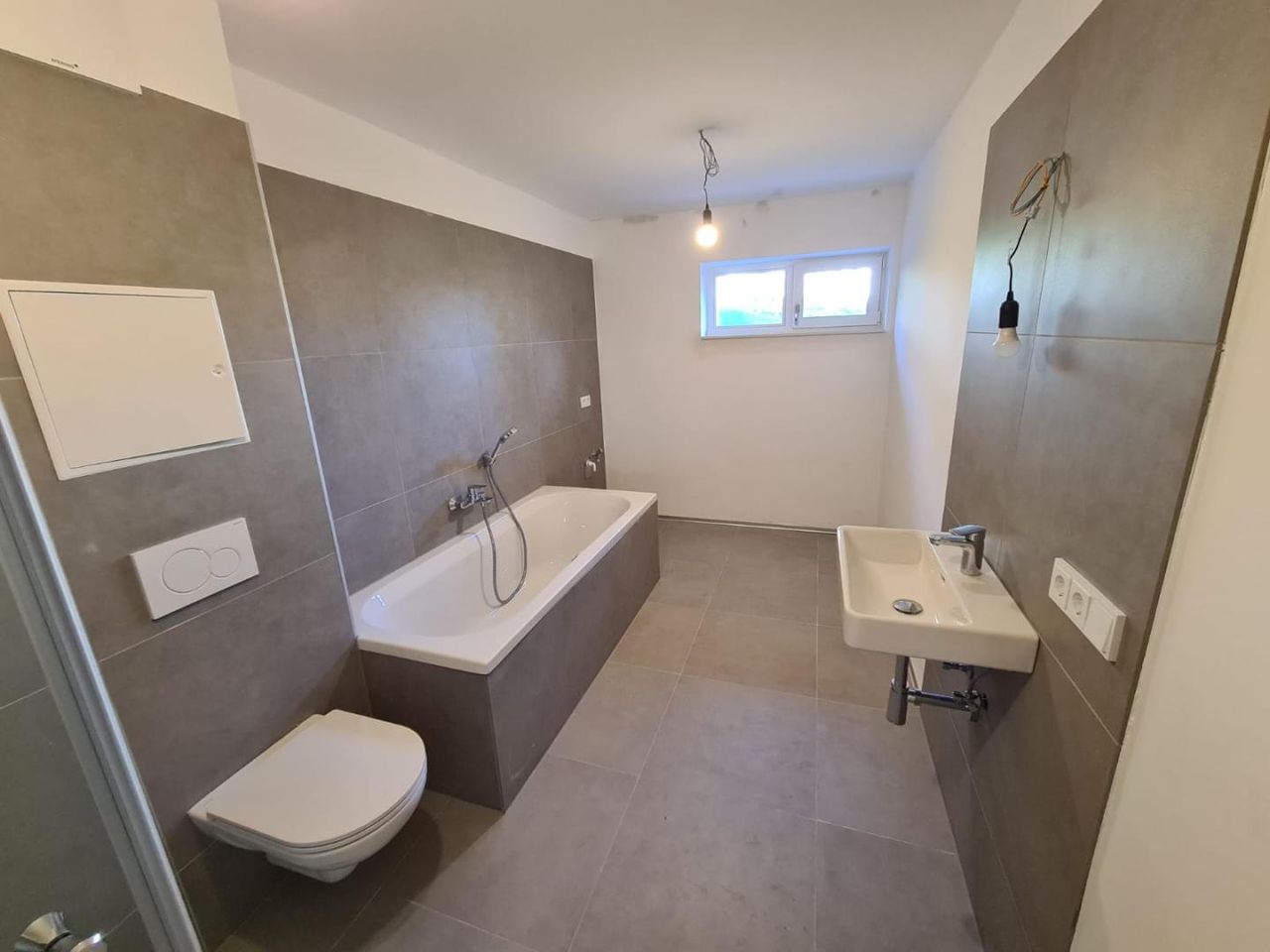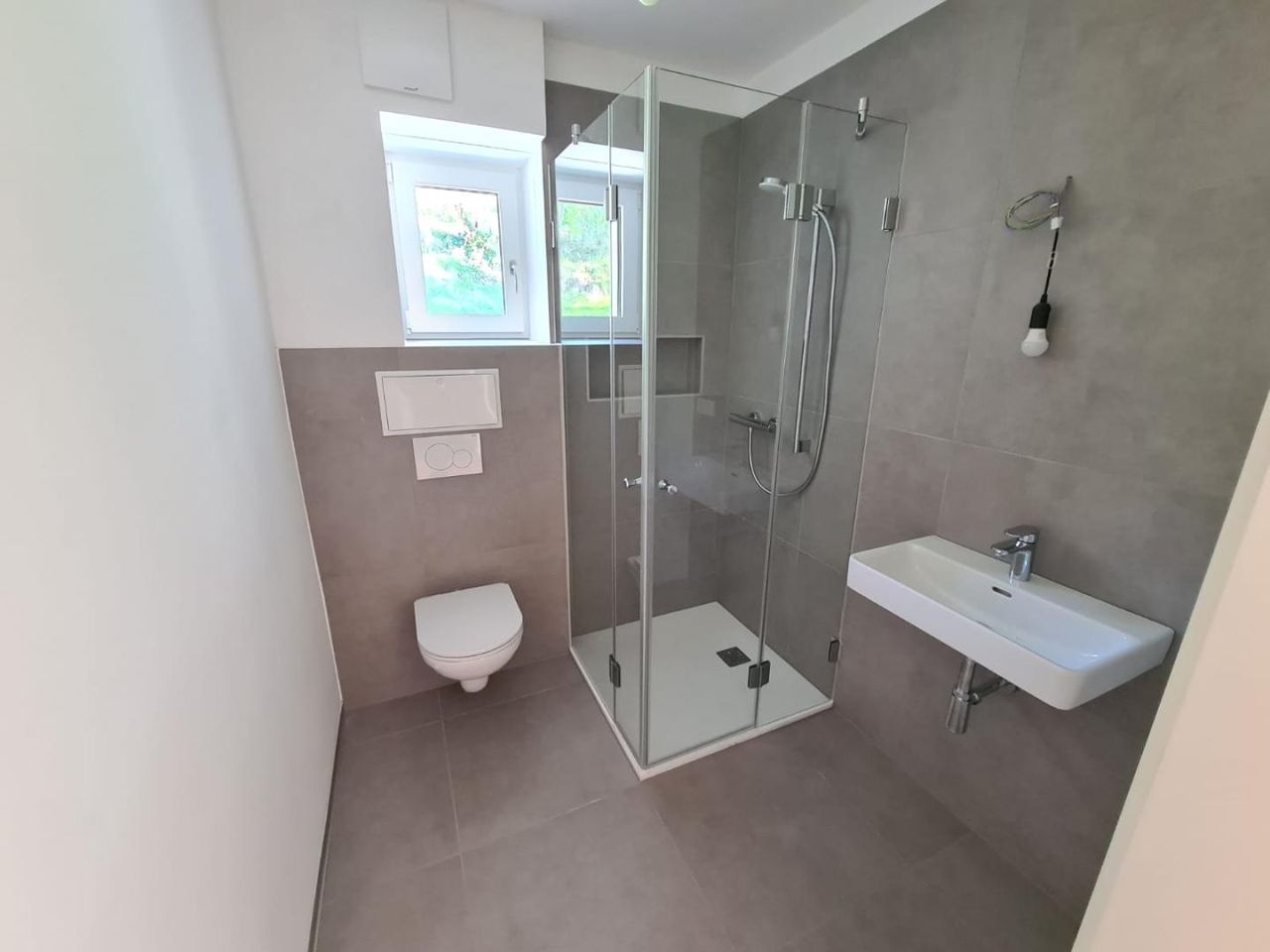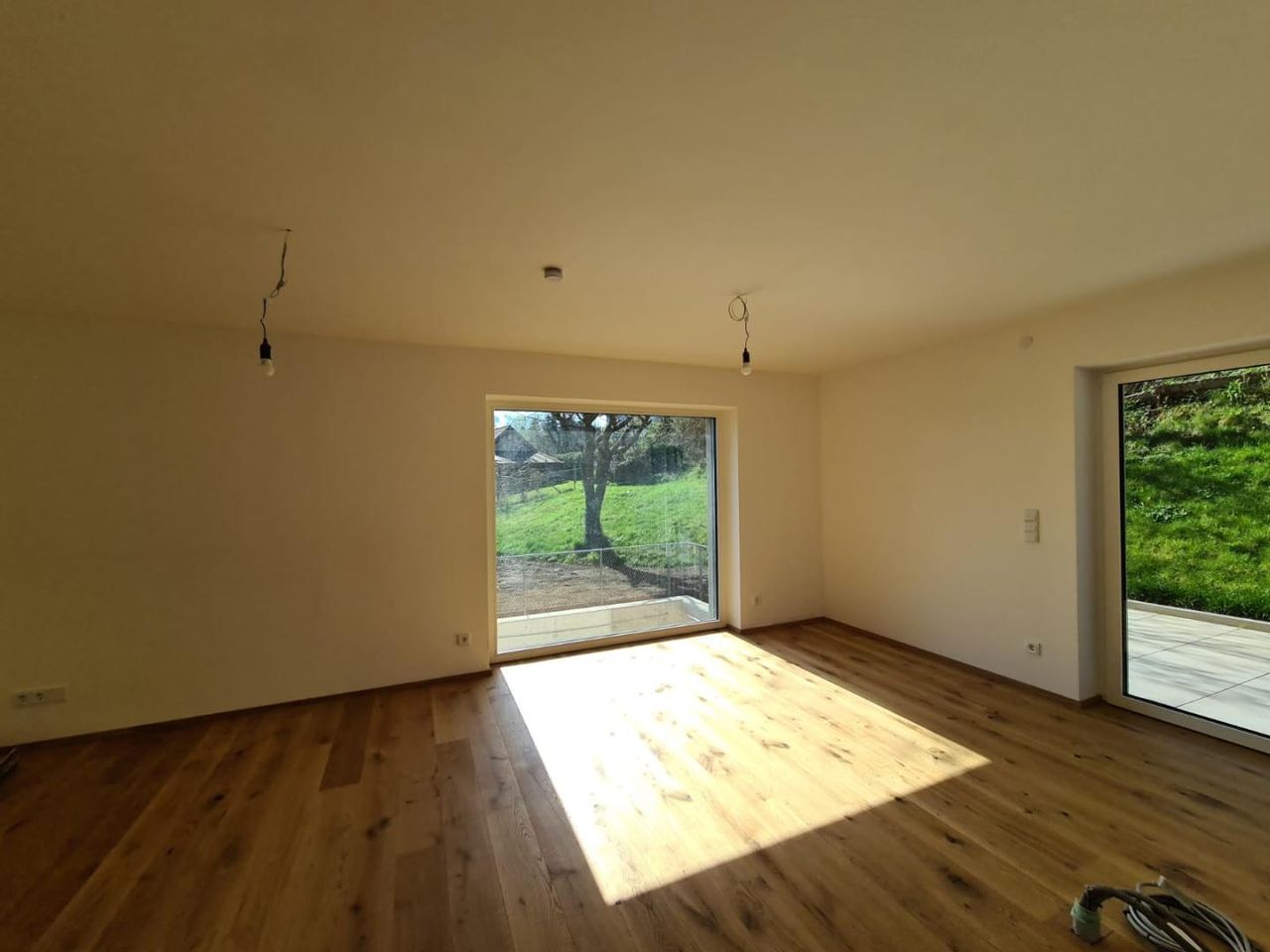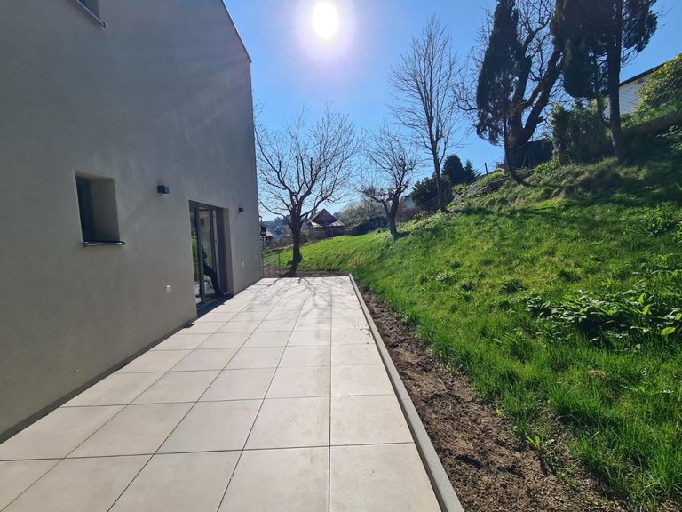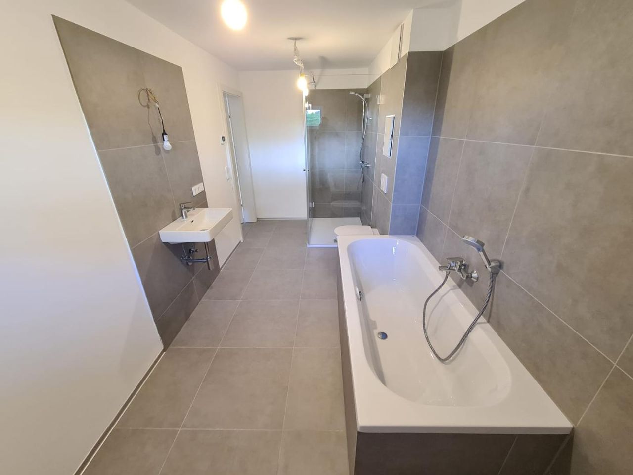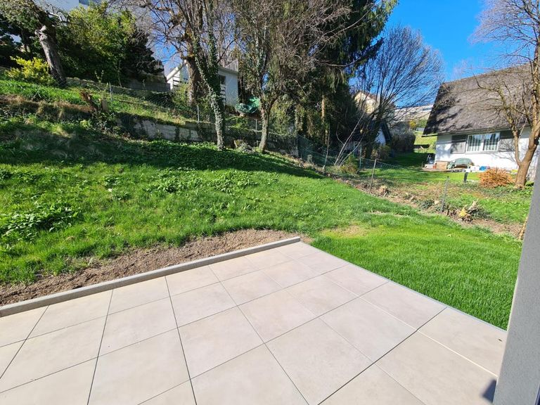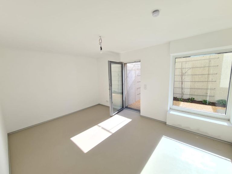 Die obere Ebene ist dem Wohnen und Genießen gewidmet. Der offene Wohn- und Essbereich wird durch große Fensterflächen mit natürlichem Licht durchflutet und bietet direkten Zugang zu einer großzügigen Terrasse mit hochwertigen Feinsteinzeug-Fliesen. Die moderne Küchenplanung fügt sich harmonisch in den Wohnraum ein und ist bereits für den Anschluss aller gängigen Geräte vorbereitet. Ein separates Schlafzimmer sowie ein stilvolles Bad/WC sorgen für ein stimmiges Raumangebot auf dieser Etage.