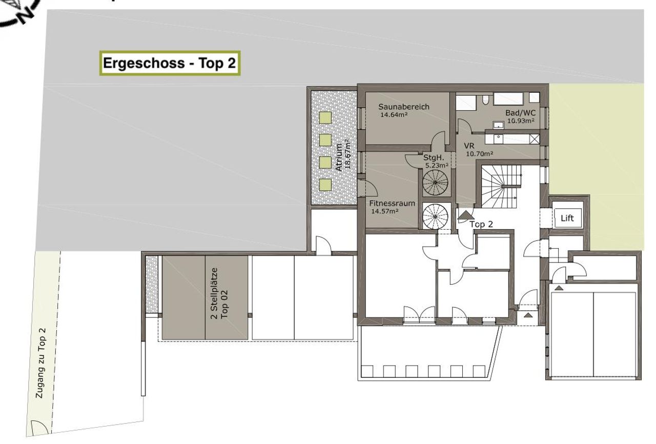 Im Erdgeschoss befindet sich ein großzügig gestalteter Eingangsbereich, von dem aus Sie die optional nutzbaren Räumlichkeiten betreten können. Hier wurde besonderer Wert auf eine angenehme Verbindung zwischen Funktionalität und Rückzug gelegt. Ein stilvoll ausgestattetes Bad/WC rundet das Angebot auf dieser Ebene ab. Das absolute Highlight der unteren Ebene ist das rund 19 m² große Atrium, das nicht nur architektonisch beeindruckt, sondern auch als geschützter, lichtdurchfluteter Außenbereich dient.