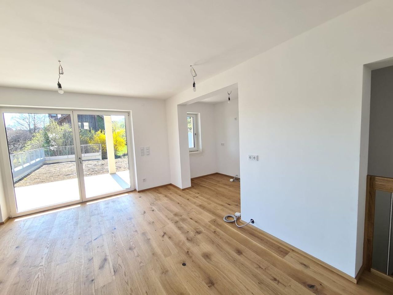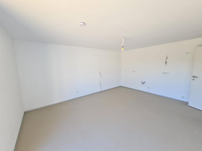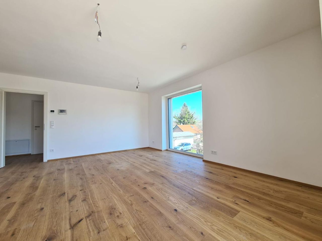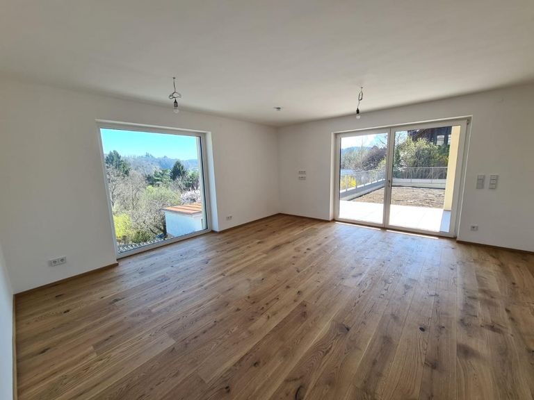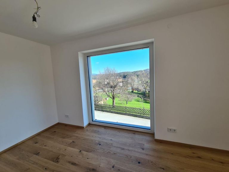 In der oberen Ebene öffnet sich ein lichtdurchfluteter Wohn- und Essbereich mit einer angrenzenden, offen gestalteten Küche. Der hochwertige Parkett in diesem Bereich schafft eine warme und wohnliche Atmosphäre. Ein separates Schlafzimmer sowie ein weiteres Badezimmer mit Dusche und WC bieten zusätzlichen Komfort. Große Holz-Aluminium-Fenster mit 3-fach-Verglasung sorgen für helle Räume und ein angenehmes Raumklima, während Raffstores Privatsphäre und Sonnenschutz garantieren.