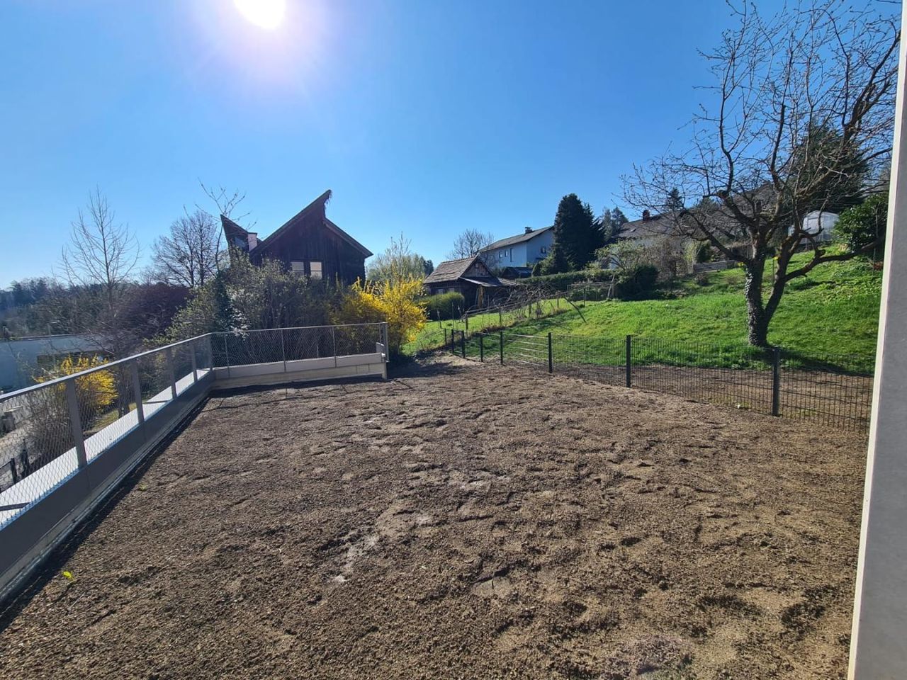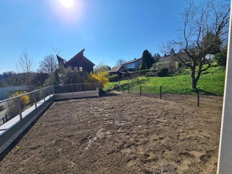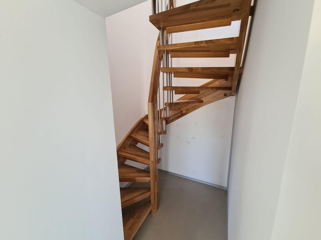 In der oberen Ebene öffnet sich ein lichtdurchfluteter Wohn- und Essbereich mit einer angrenzenden, offen gestalteten Küche. Der hochwertige Parkett in diesem Bereich schafft eine warme und wohnliche Atmosphäre. Ein separates Schlafzimmer sowie ein weiteres Badezimmer mit Dusche und WC bieten zusätzlichen Komfort. Große Holz-Aluminium-Fenster mit 3-fach-Verglasung sorgen für helle Räume und ein angenehmes Raumklima, während Raffstores Privatsphäre und Sonnenschutz garantieren.