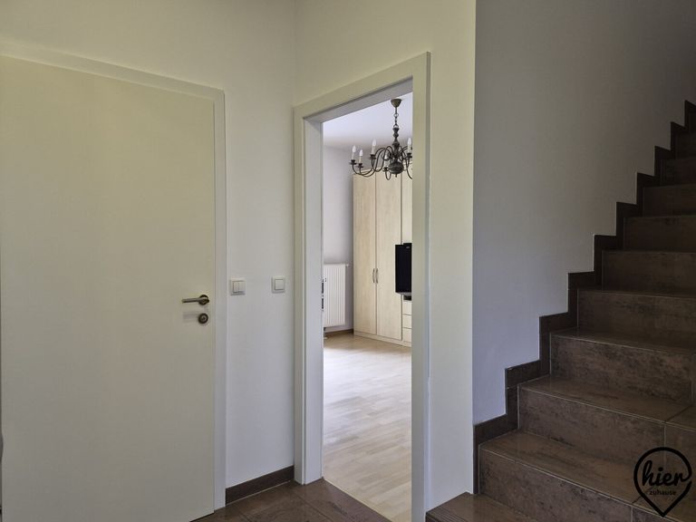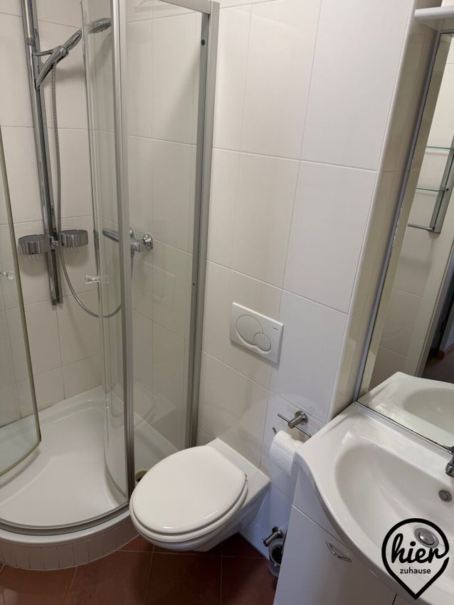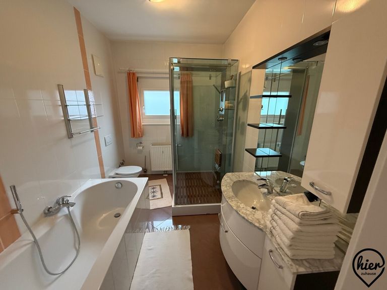 Im Obergeschoss befindet sich der großzügige Wohnbereich sowie Küche (mit Geschirrspüler und Waschmaschine), Abstellraum, Schlafzimmer und WC mit Waschtisch und Dusche. Im Untergeschoß liegt das Bad mit Wanne und Hitech-Dampfdusche, sowie das Gartenzimmer mit einem, zB als begehbarer Schrank nutzbarem, zweiten Abstellraum.