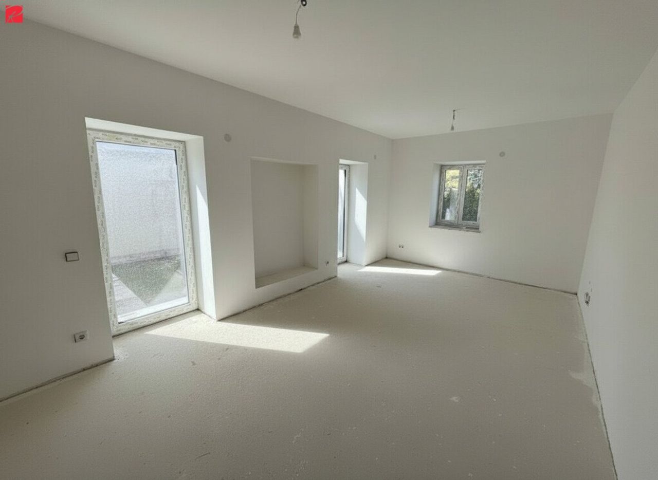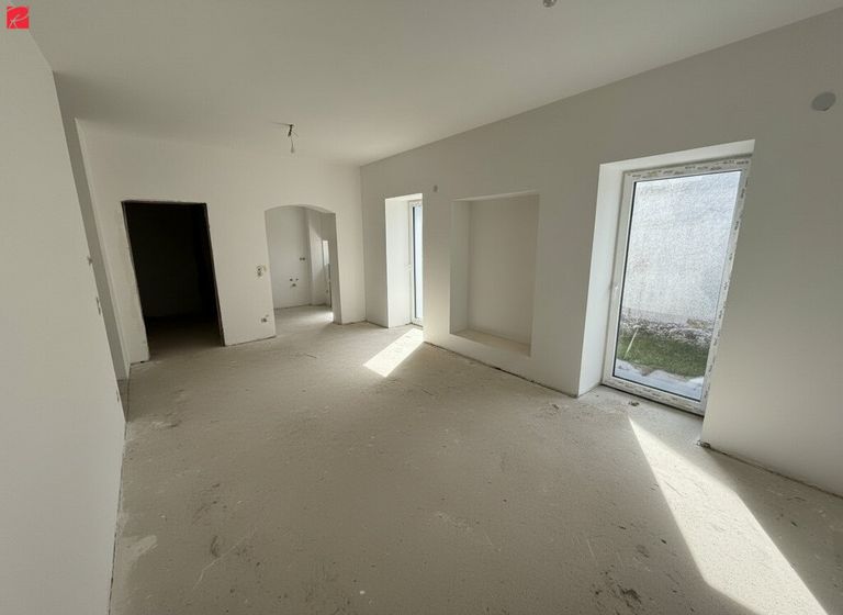 Besonders hervorzuheben sind die stilprägenden Elemente wie elegante Rundbögen, die großzügige Raumhöhe sowie die hervorragende Belichtung der Räumlichkeiten – hier entsteht eine Atmosphäre, die modernen Wohnkomfort mit besonderem Charakter verbindet. Der großzügige Wohnbereich wird durch große Fensterflächen lichtdurchflutet und bietet direkten Zugang in den Garten. Ergänzt wird dieser durch eine integrierte Küchensituation, die sich harmonisch in das Raumkonzept einfügt und durch eine Fixverglasung einen Blick in den Garten ermöglicht.