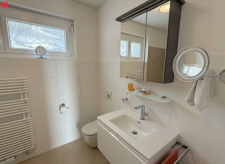 Die beiden freundlichen Schlafzimmer bieten Ihnen Zugang zur Terrasse und sind zusätzlich mit bodenbündigen Fenstern inkl. Beschattung ausgestattet. Ein (Doppel-)Bett, sowie ein geräümiger Kasten finden hier gut ihren Platz. In der Küche erwarten Sie reichlich Arbeitsflächen und Stauraum, sowie hochwertige Küchengeräte zum Zubereiten von Köstlichkeiten. Durch die offene Raumgestaltung, bleiben Sie trotz Vorbereitungsarbeiten im Gespräch mit Ihren Gästen. Das in stilvollem beige gehaltene Badezimmer ist mit einem Fenster, einem Waschtisch, einem Handtuchtrocker, einer eleganten Walk-In Dusche mit Fixglas-Element und einer Regendusche ausgestattet.