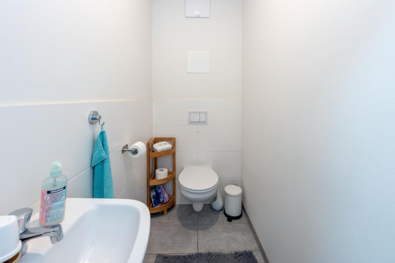 - modernes Badezimmer mit Dusche, Waschbecken und Waschmaschinenanschluss