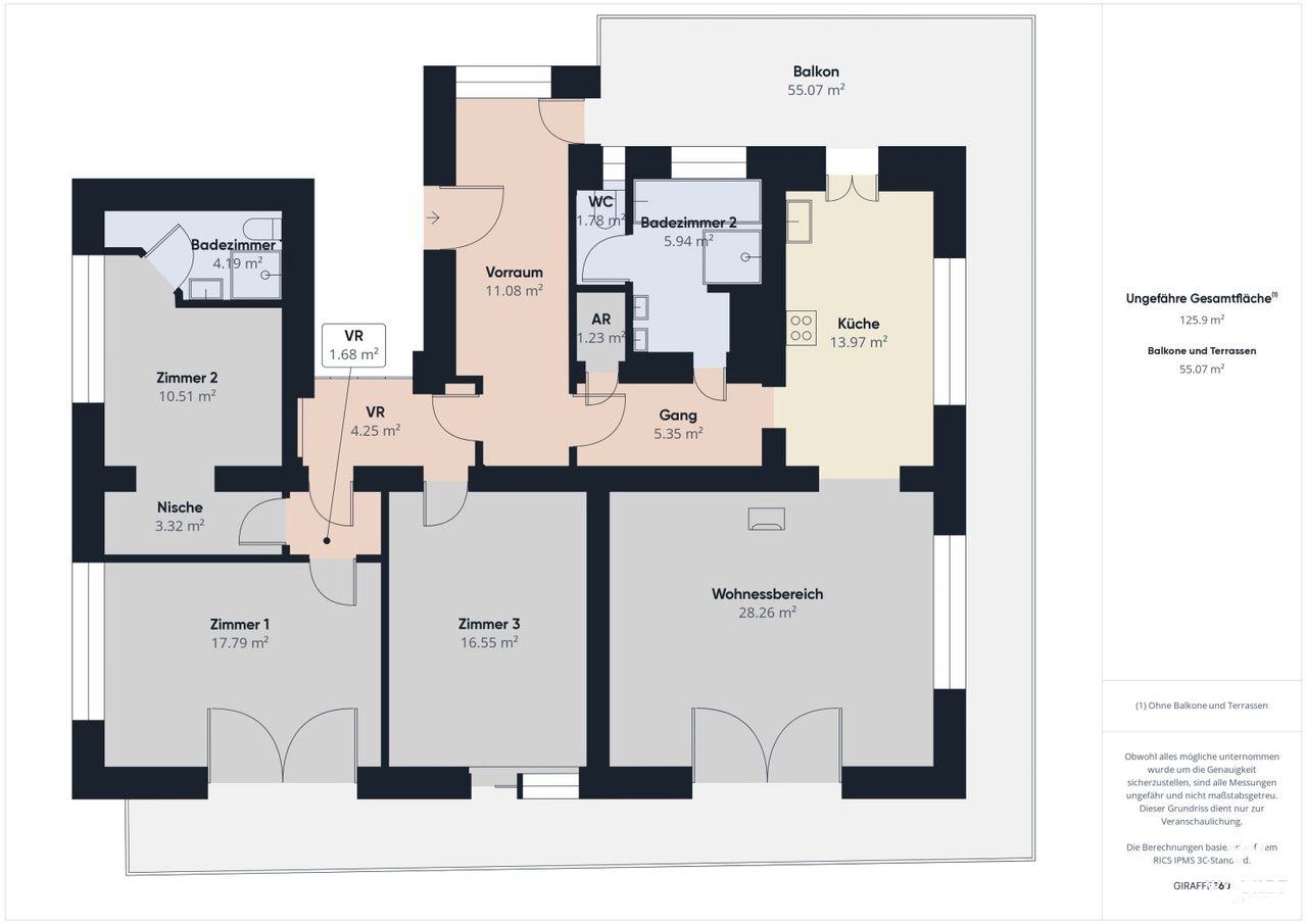 - 55 m² großer Balkon der von 3 Zimmern und der Küche aus begehbar ist