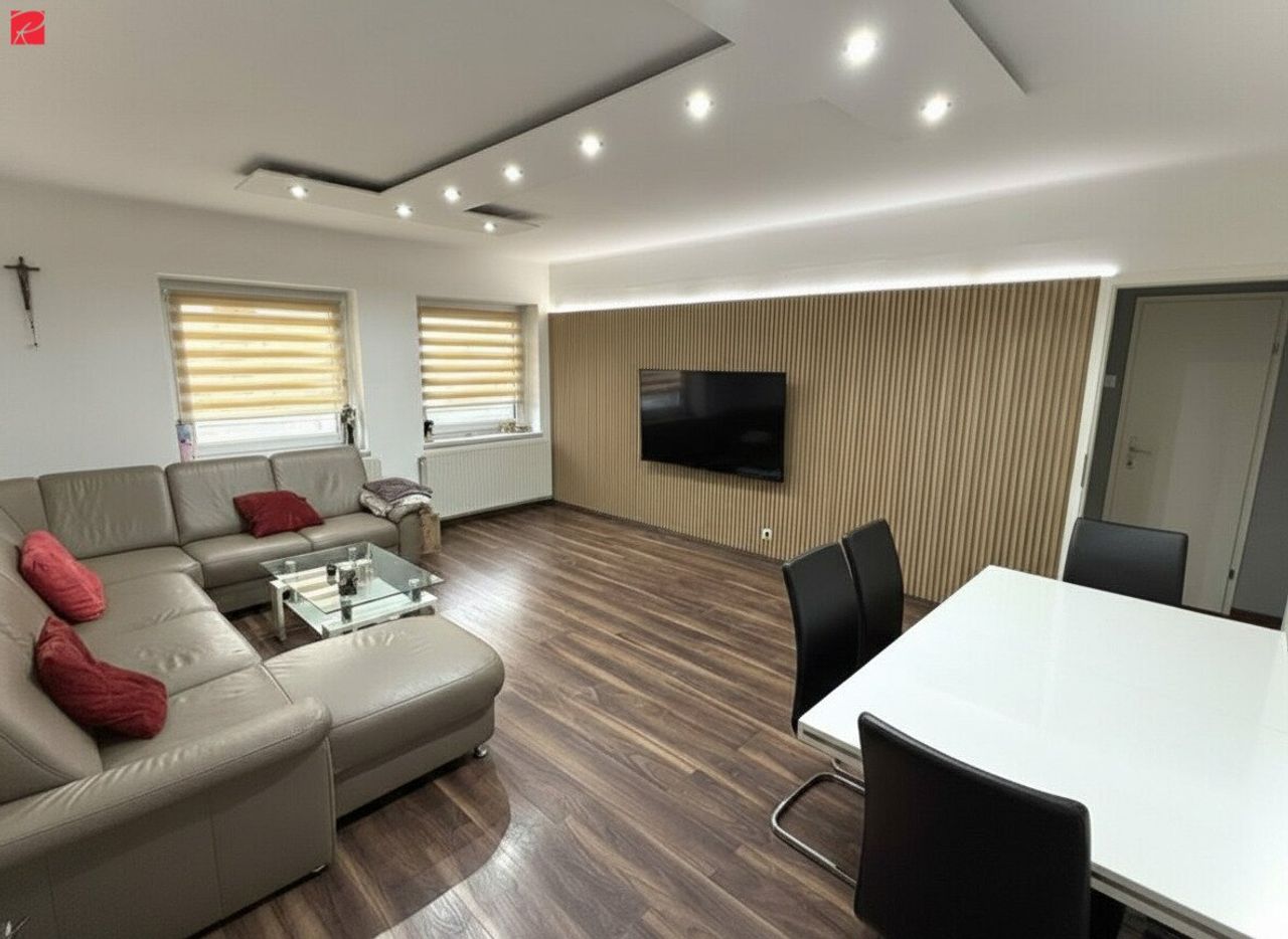 Angrenzend öffnet sich der südlich ausgerichtete Wohnbereich – ein echtes Herzstück der Wohnung. Zwei große Kunststofffenster durchfluten den Raum mit Licht. Hier findet mühelos ein großer Esstisch für die ganze Familie Platz, ebenso wie ein gemütliches Sofa, eine Spielecke für Kinder und der Fernseher für entspannte Abende.
