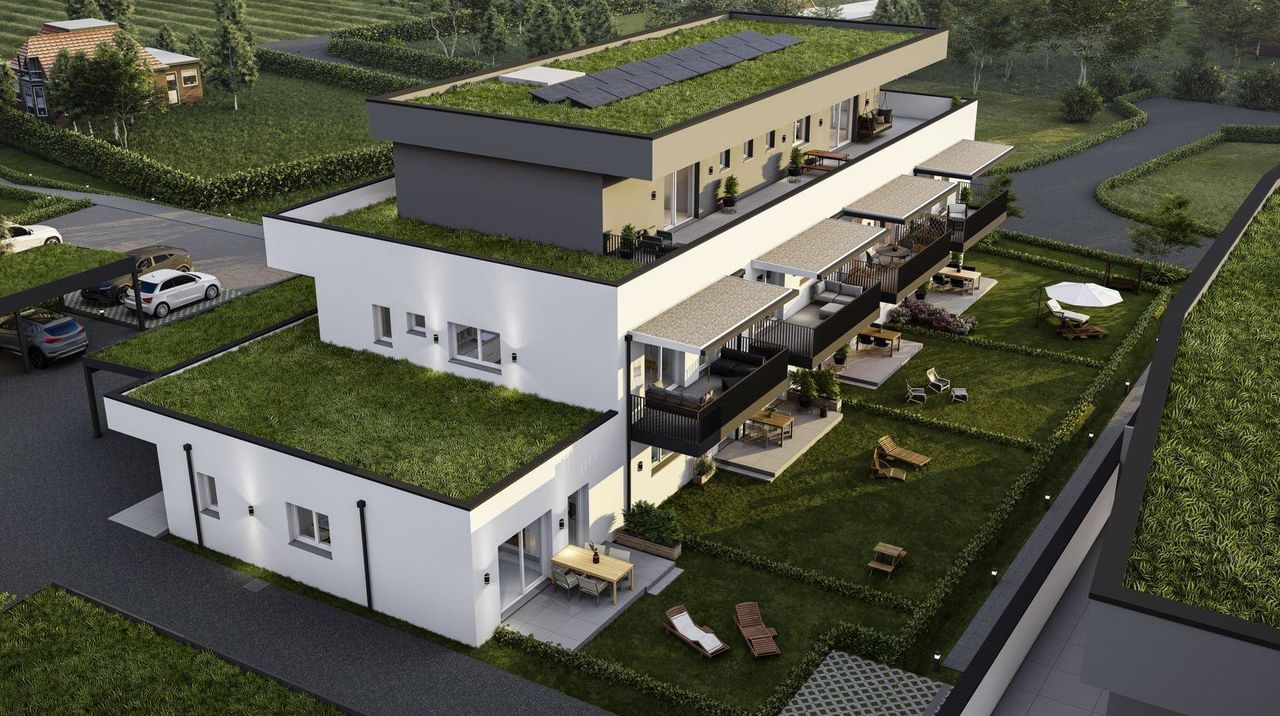 Jeder der beiden Baukörper ist optimal ausgerichtet, um eine helle und freundliche Wohnatmosphäre zu schaffen. Während ein Gebäude 9 Wohneinheiten beherbergt, verfügt das zweite 10 Wohnungen. Trotz der idyllischen Lage ist die Anbindung an den öffentlichen Verkehr optimal: Eine Bushaltestelle befindet sich nur wenige Gehminuten entfernt, während der nächstgelegene Bahnhof mit Zuganbindung in etwa 5 Autominuten erreichbar ist.