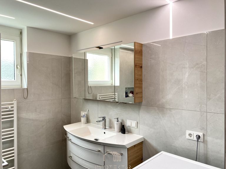 Die elegant abgehängte Decke mit integrierter Beleuchtung unterstreicht den modernen Charakter und schafft ein stilvolles Wohnambiente.