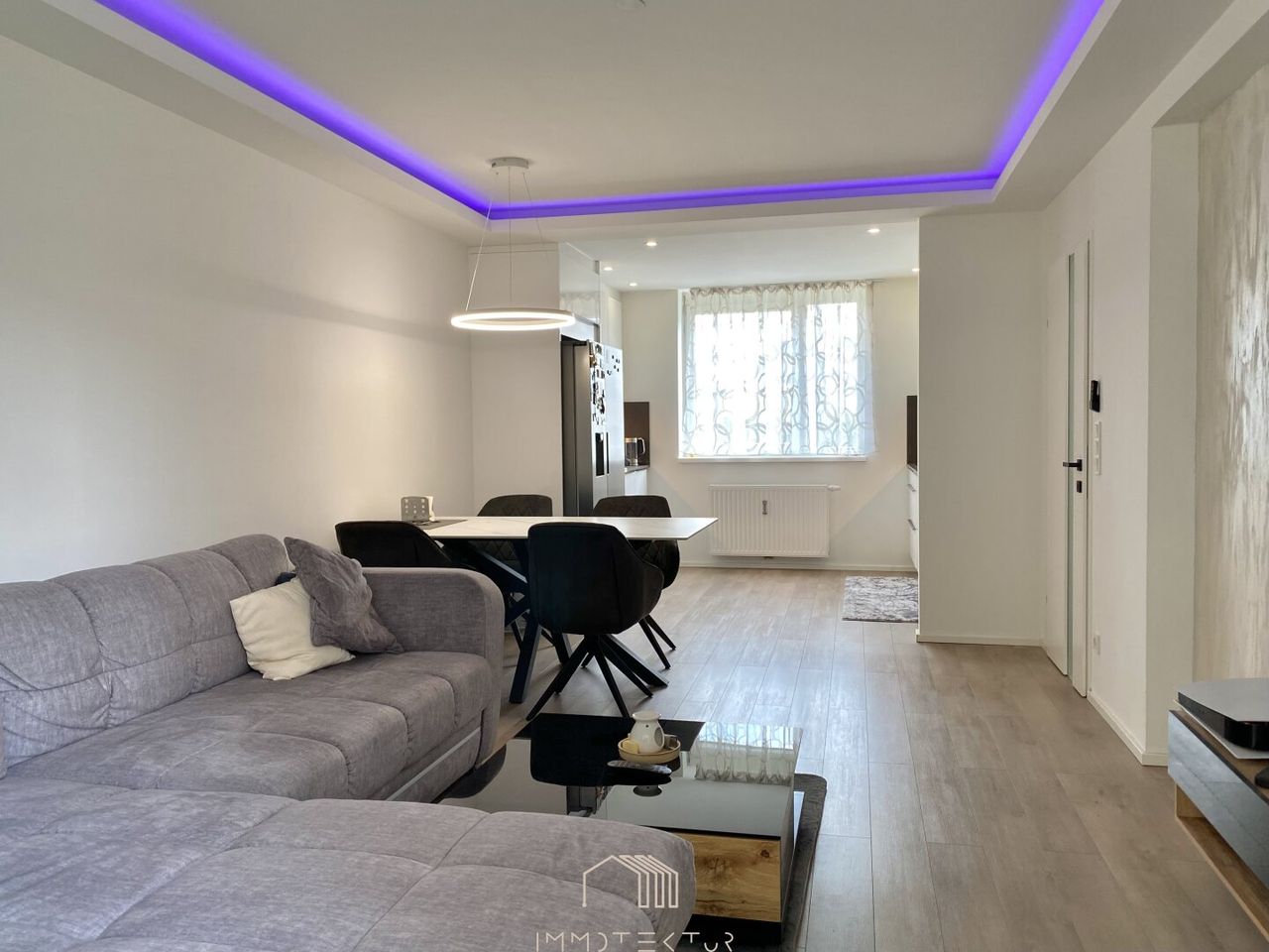 Der großzügige Wohn-, Koch- und Essbereich bildet das Herzstück der Wohnung. Große Terrassentüren sorgen für viel Tageslicht und eine fließende Verbindung zwischen Innen- und Außenbereich.