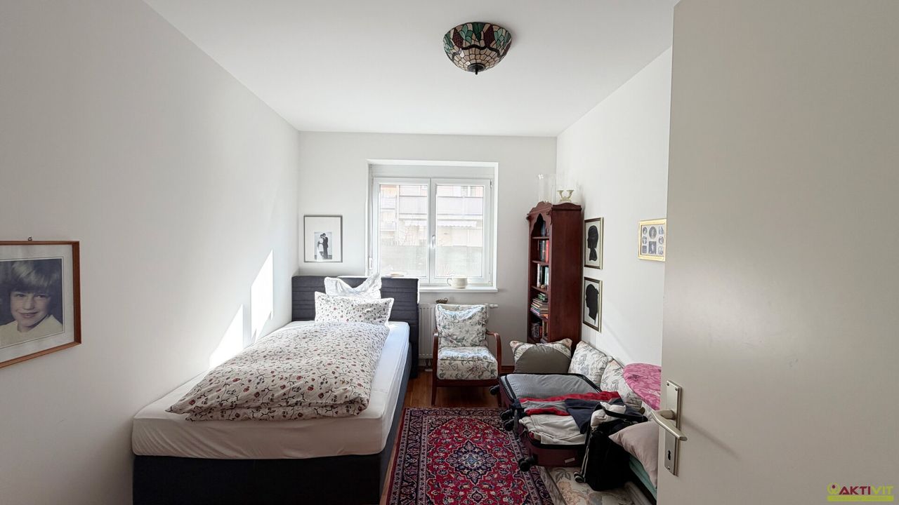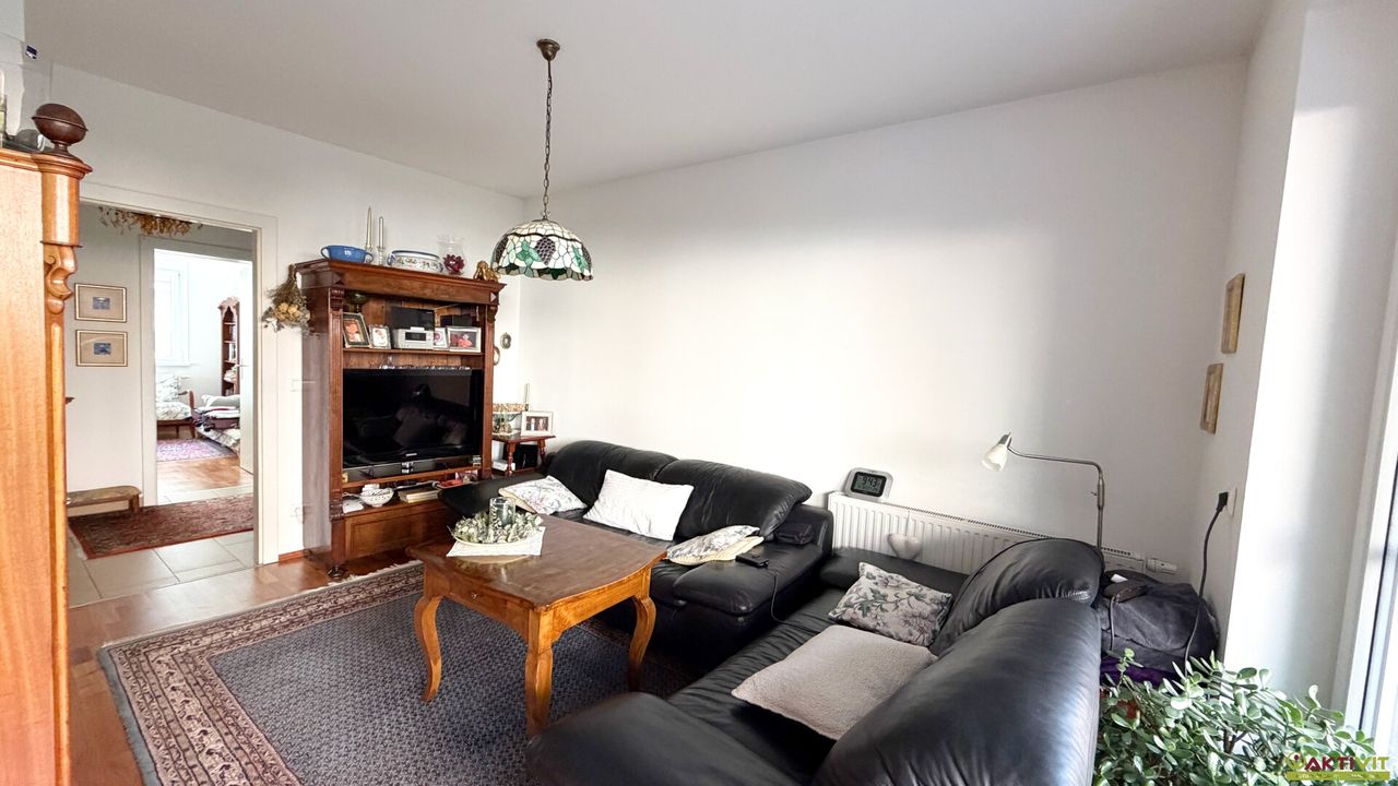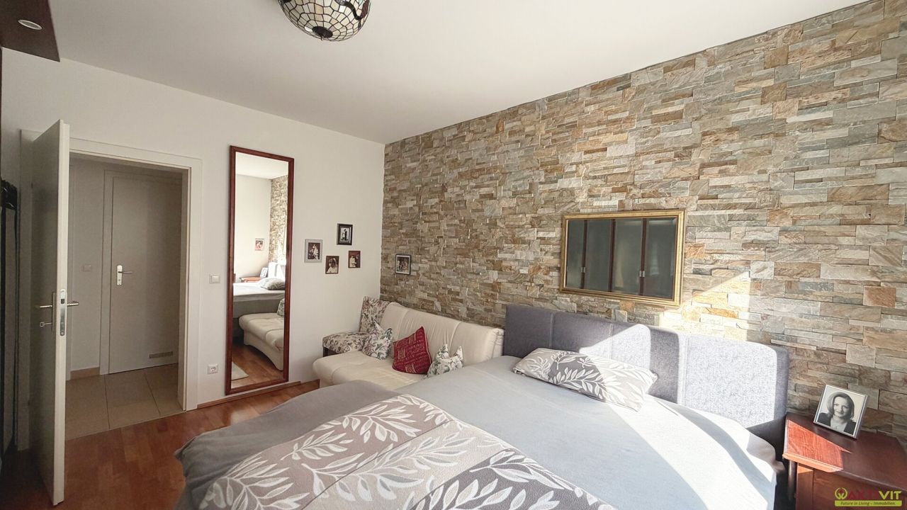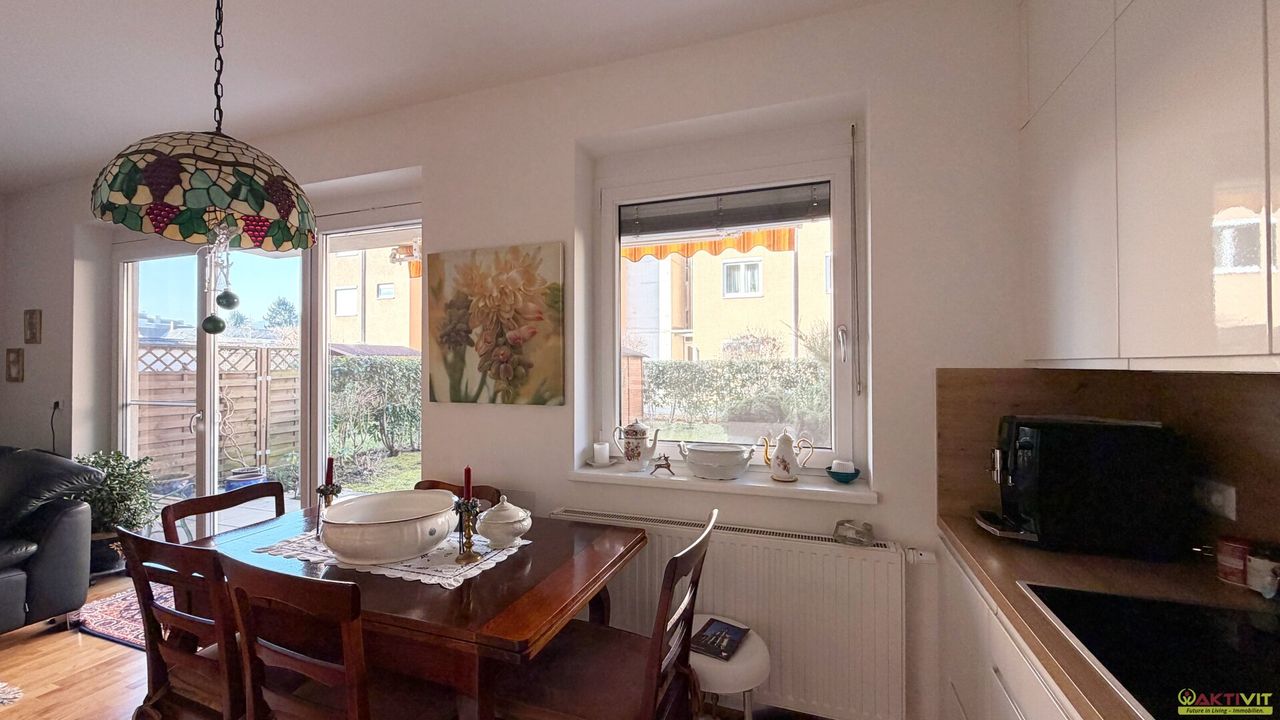 Die Wohnung verfügt über eine Wohnfläche von rund 66 m² und überzeugt mit einer stimmigen, alltagstauglichen Raumaufteilung. Vom Vorraum aus sind die Räume zentral erschlossen. Zur Verfügung stehen ein Wohnbereich, eine Küche mit Essplatz, zwei weitere Zimmer, ein Badezimmer sowie ein separates WC. Der Wohnbereich wirkt durch die große Glasfläche angenehm hell und bietet einen direkten Übergang auf die westseitige Terrasse und weiter in den Garten. Die beiden weiteren Zimmer präsentieren sich freundlich und gut nutzbar, wobei eines davon durch die markante Wandgestaltung einen besonders wohnlichen Charakter erhält. Ergänzt wird das Angebot durch ein Kellerabteil mit ca. 5 m² sowie einen Garagenplatz.