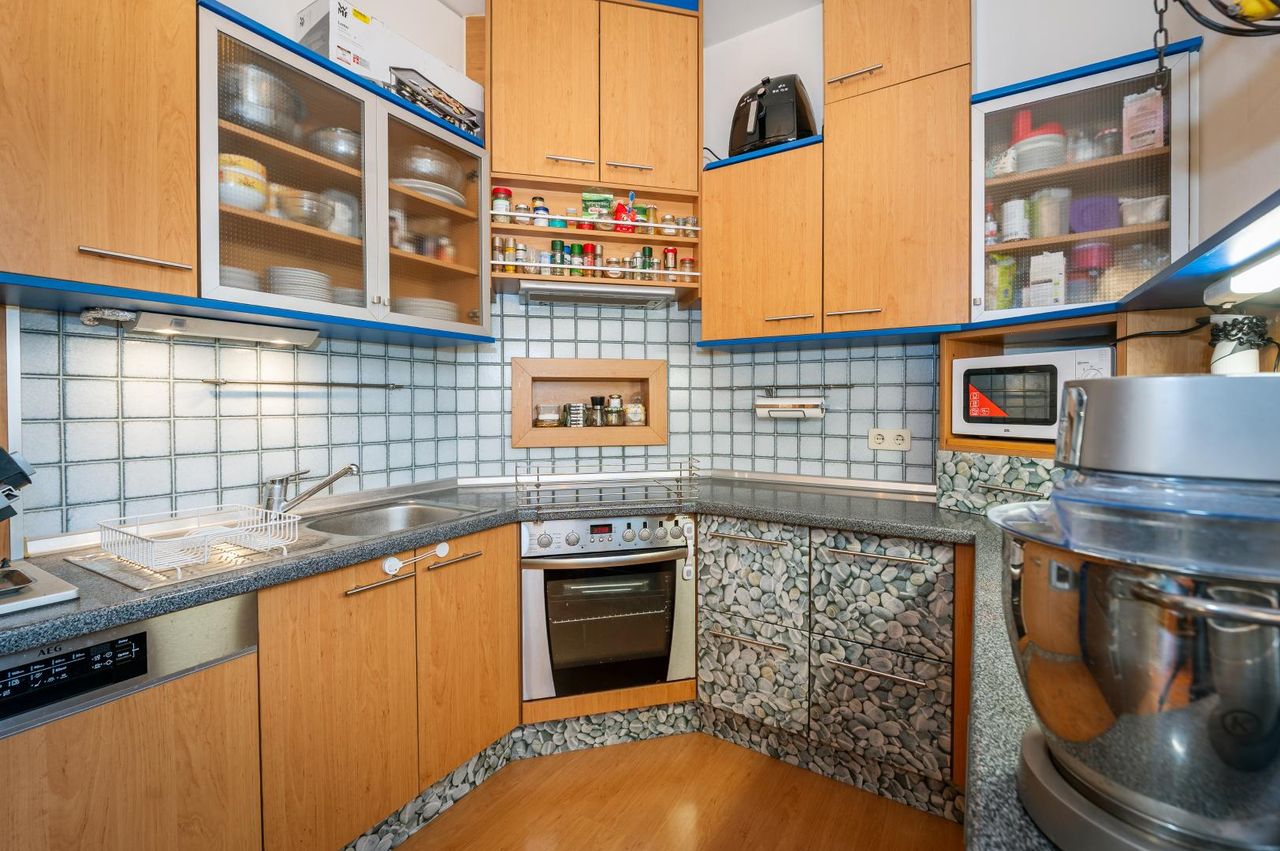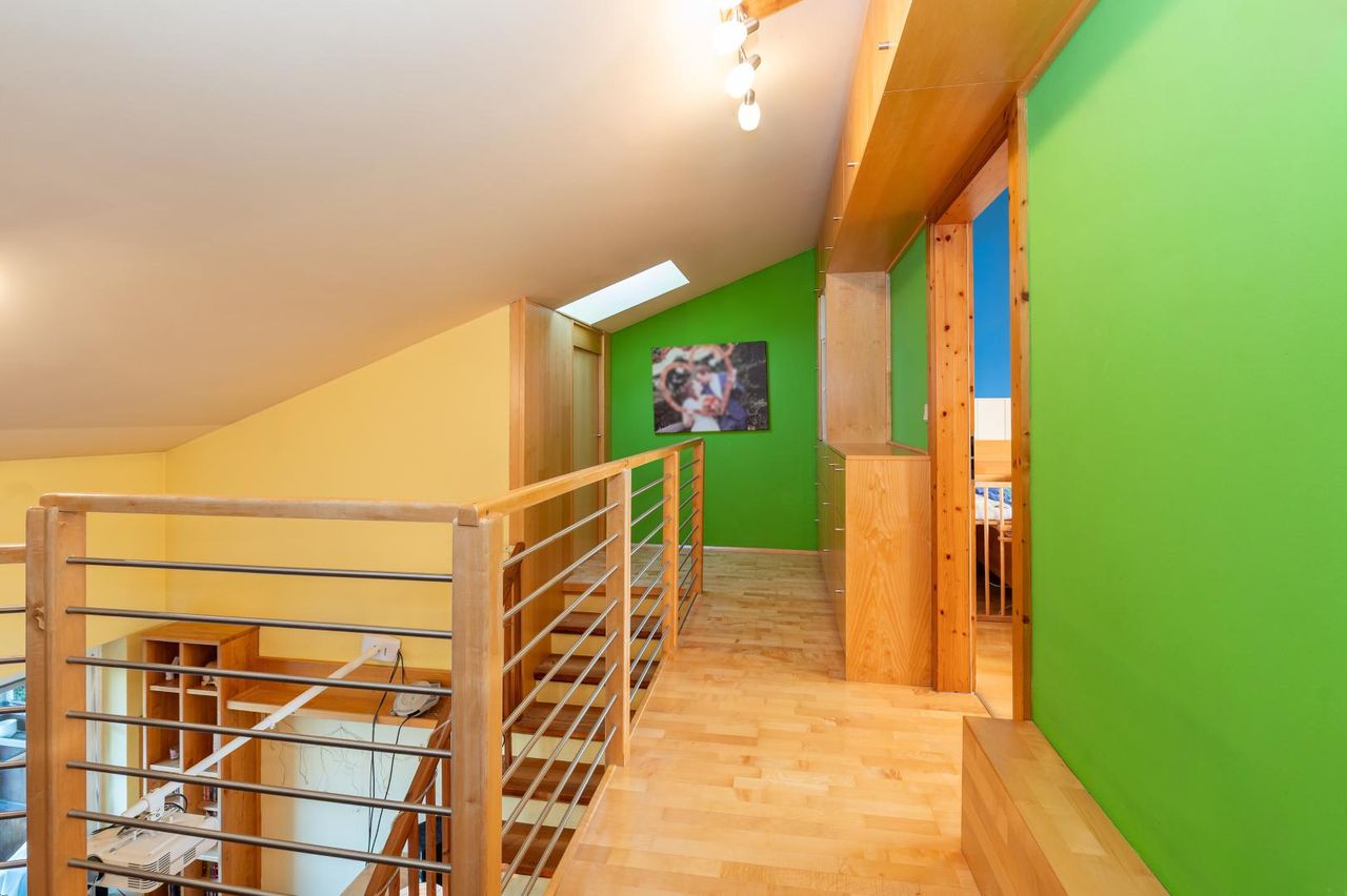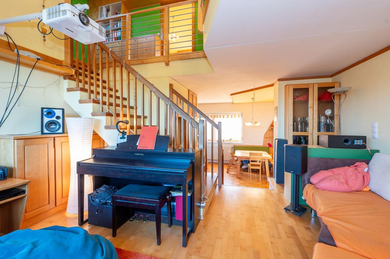 Die Wohnung erstreckt sich über zwei Ebenen und schafft durch ihre gute Raumaufteilung, ihre offene Gestaltung und eine gemütliche Galerie ein besonderes Wohnambiente. Helle Räume und die liebevolle Ausstattung mit maßgefertigten Tischler-Einbaumöbeln verleihen dem Zuhause eine zeitlose Eleganz.