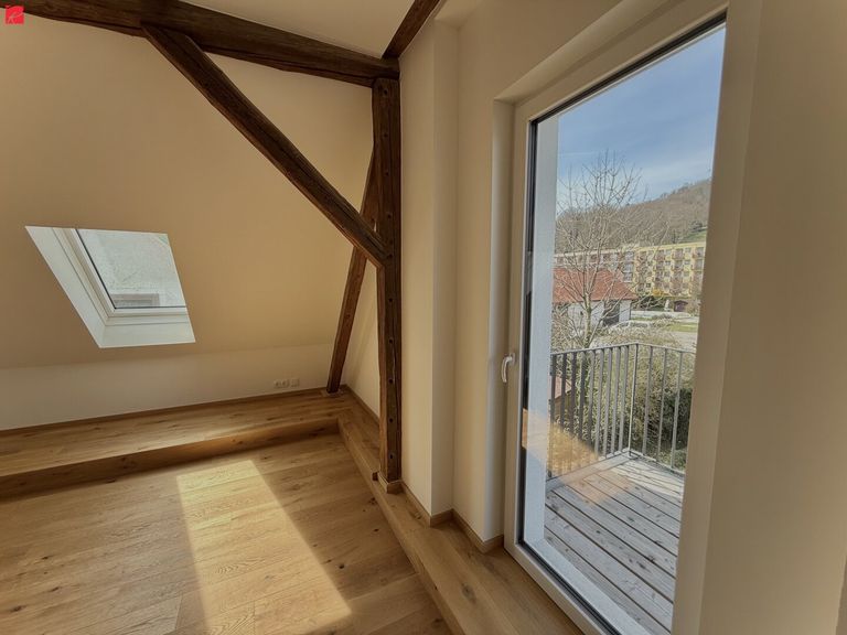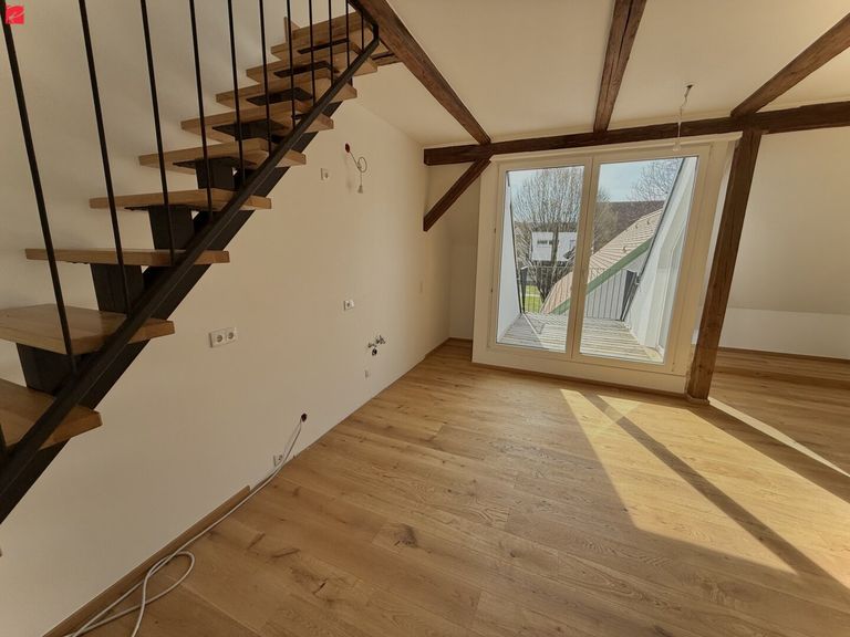 Ein absolutes Highlight ist die Galerie im oberen Bereich, die über einen stilvoll integrierten Stiegenaufgang erreichbar ist. Die Gestaltung der Treppe mit ihren modernen Handläufen fügt sich harmonisch in das Gesamtbild der Wohnung ein. Die Galerie selbst eröffnet durch eine Fixverglasung einen beeindruckenden Blick auf das Schloss St. Martin und bietet vielseitige Nutzungsmöglichkeiten – ob als Homeoffice, Spielbereich oder persönlicher Rückzugsort.