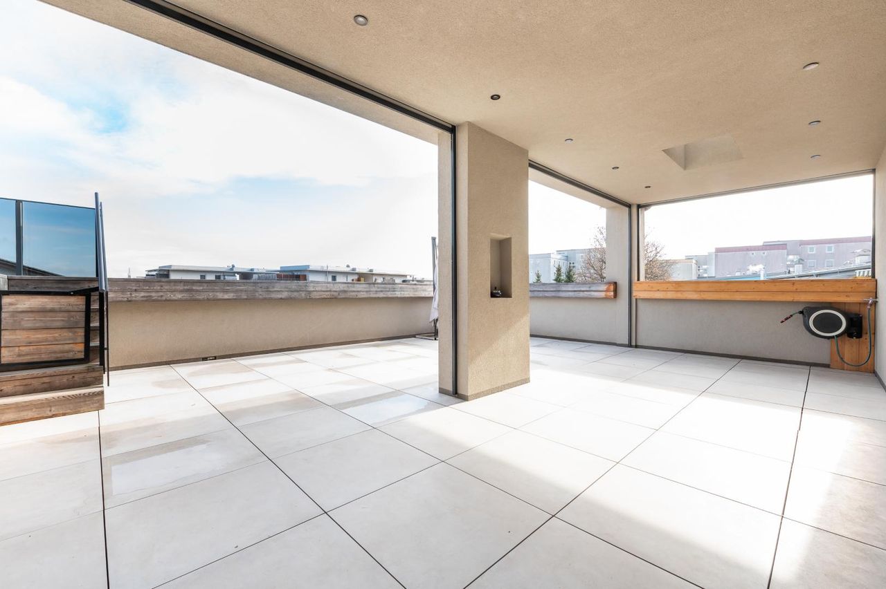 Ein absolutes Highlight stellt die rund 73 m² große Terrasse dar. Etwa 45 m² davon sind überdacht und zusätzlich mit Sonnen- und Windschutz ausgestattet, wodurch ein ganzjährig nutzbarer Außenbereich entsteht. Auf der Terrasse befindet sich ein exklusives Swim-Spa, das den privaten Wellnesscharakter dieser Penthousewohnung eindrucksvoll unterstreicht.