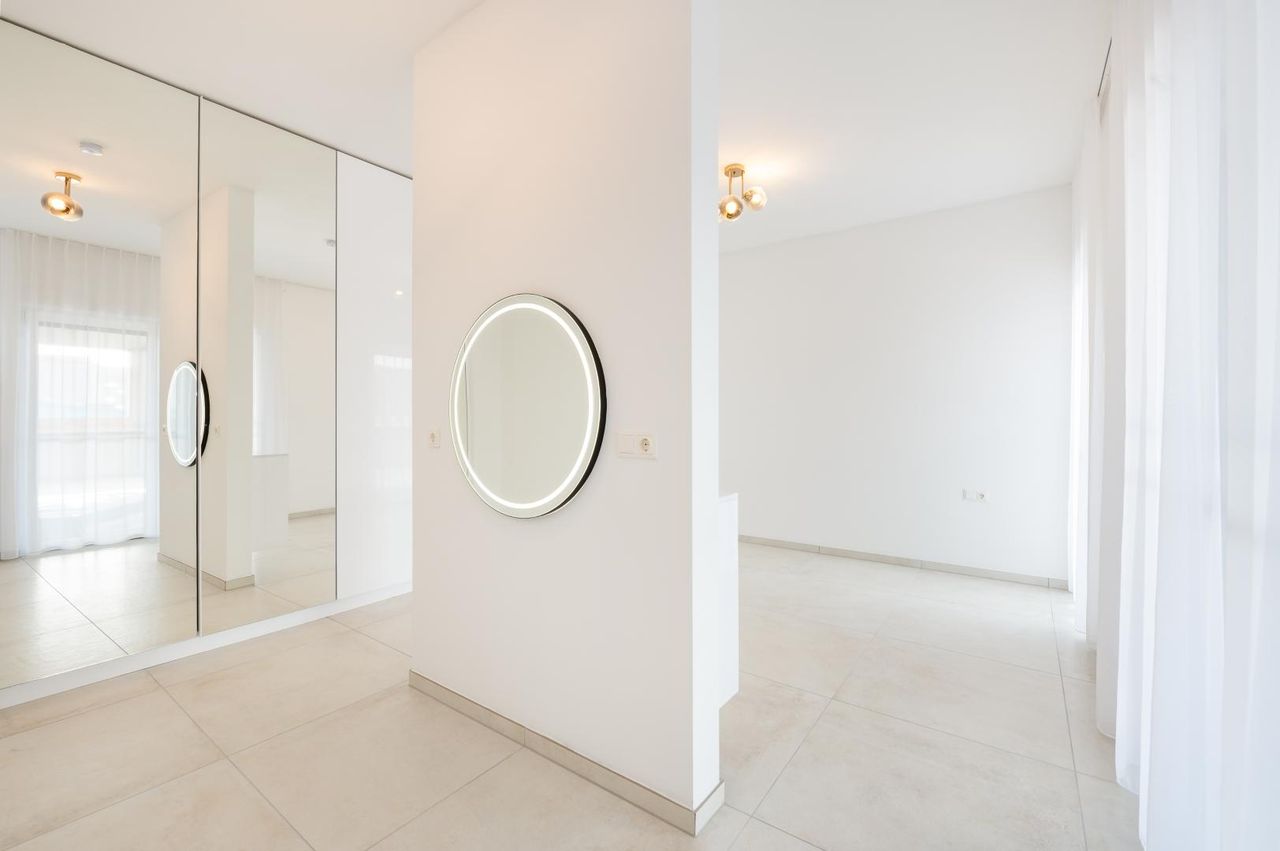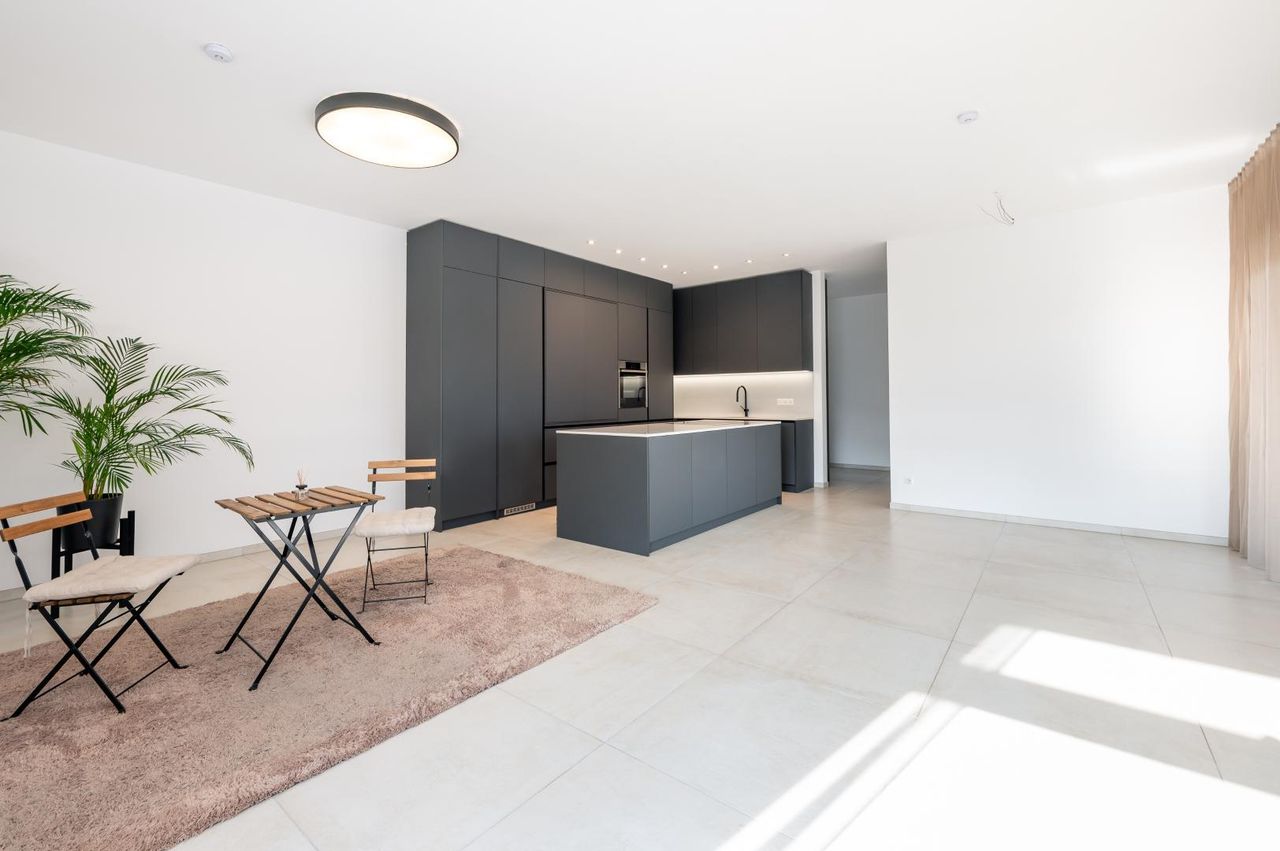 Die Raumaufteilung umfasst einen großzügigen Wohn-/Essbereich mit offener, Küche, einen einladenden Vorraum, einen Abstellraum, ein separates WC, ein perfekt ausgestattetes Badezimmer, ein Zimmer sowie ein weiteres großes Schlafzimmer mit integriertem Ankleidebereich. Hochwertige Fliesenböden sowie individuell gefertigte Tischlermöbel unterstreichen den exklusiven Anspruch dieser Immobilie.