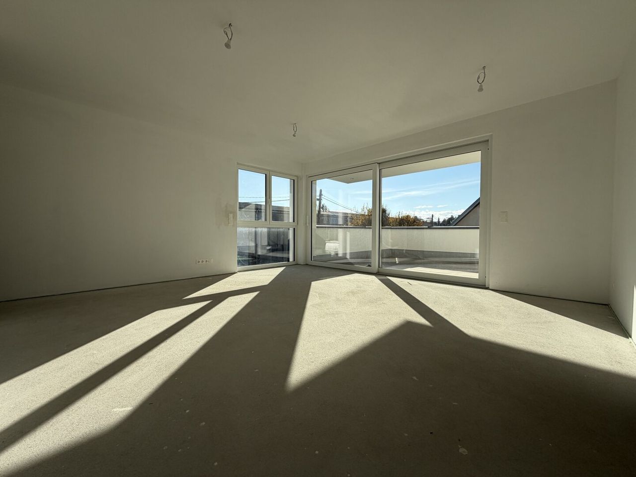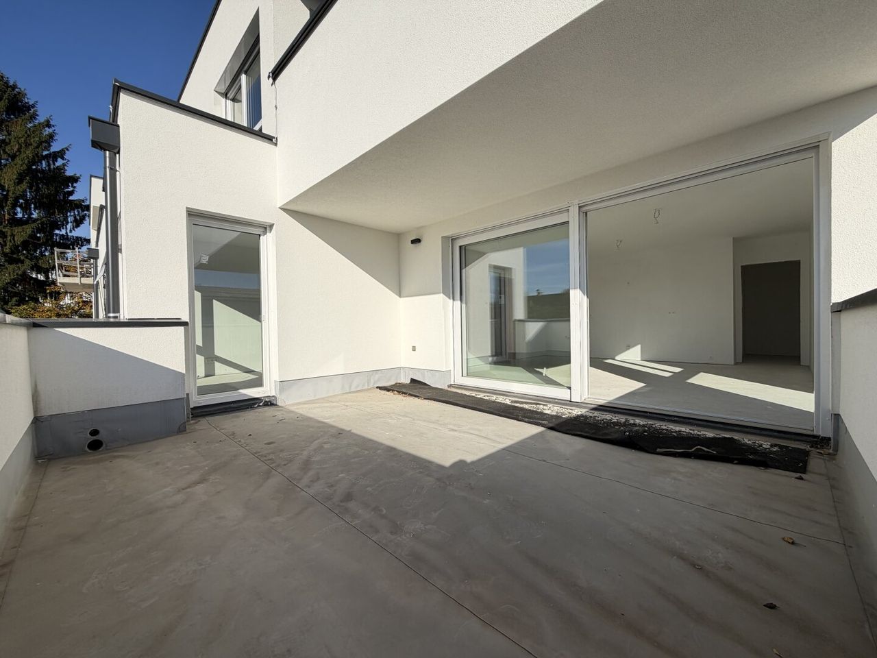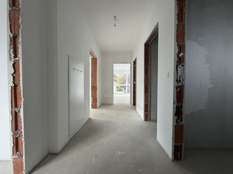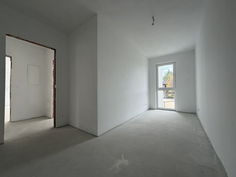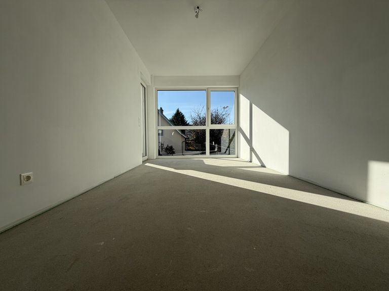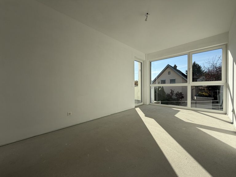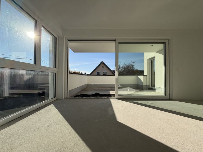 Über einen hellen Vorraum gelangen Sie in den offenen Wohn- und Essbereich. Vom Wohnbereich aus gibt es einen fließenden Übergang auf die sonnige Terrasse. Diese Wohnung besitzt außerdem 3 Schlafzimmer, ein Badezimmer, ein getrennt begehbares WC und einen Abstellraum.